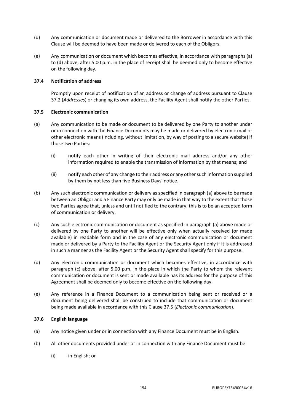 154 EUROPE/73490034v16 (d) Any communication or document made or delivered to the Borrower in accordance with this Clause will be deemed to have been made or delivered to each of the Obligors. (e) Any communication or document which becomes effective, in accordance with paragraphs (a) to (d) above, after 5.00 p.m. in the place of receipt shall be deemed only to become effective on the following day. 37.4 Notification of address Promptly upon receipt of notification of an address or change of address pursuant to Clause 37.2 (Addresses) or changing its own address, the Facility Agent shall notify the other Parties. 37.5 Electronic communication (a) Any communication to be made or document to be delivered by one Party to another under or in connection with the Finance Documents may be made or delivered by electronic mail or other electronic means (including, without limitation, by way of posting to a secure website) if those two Parties: (i) notify each other in writing of their electronic mail address and/or any other information required to enable the transmission of information by that means; and (ii) notify each other of any change to their address or any other such information supplied by them by not less than five Business Days' notice. (b) Any such electronic communication or delivery as specified in paragraph (a) above to be made between an Obligor and a Finance Party may only be made in that way to the extent that those two Parties agree that, unless and until notified to the contrary, this is to be an accepted form of communication or delivery. (c) Any such electronic communication or document as specified in paragraph (a) above made or delivered by one Party to another will be effective only when actually received (or made available) in readable form and in the case of any electronic communication or document made or delivered by a Party to the Facility Agent or the Security Agent only if it is addressed in such a manner as the Facility Agent or the Security Agent shall specify for this purpose. (d) Any electronic communication or document which becomes effective, in accordance with paragraph (c) above, after 5.00 p.m. in the place in which the Party to whom the relevant communication or document is sent or made available has its address for the purpose of this Agreement shall be deemed only to become effective on the following day. (e) Any reference in a Finance Document to a communication being sent or received or a document being delivered shall be construed to include that communication or document being made available in accordance with this Clause 37.5 (Electronic communication). 37.6 English language (a) Any notice given under or in connection with any Finance Document must be in English. (b) All other documents provided under or in connection with any Finance Document must be: (i) in English; or