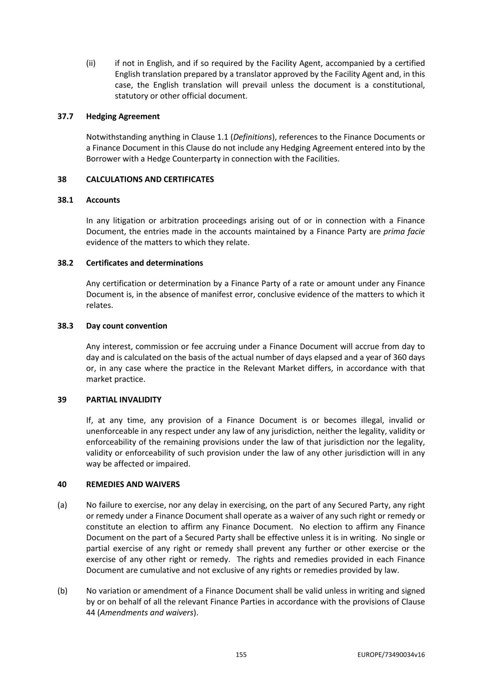 155 EUROPE/73490034v16 (ii) if not in English, and if so required by the Facility Agent, accompanied by a certified English translation prepared by a translator approved by the Facility Agent and, in this case, the English translation will prevail unless the document is a constitutional, statutory or other official document. 37.7 Hedging Agreement Notwithstanding anything in Clause 1.1 (Definitions), references to the Finance Documents or a Finance Document in this Clause do not include any Hedging Agreement entered into by the Borrower with a Hedge Counterparty in connection with the Facilities. 38 CALCULATIONS AND CERTIFICATES 38.1 Accounts In any litigation or arbitration proceedings arising out of or in connection with a Finance Document, the entries made in the accounts maintained by a Finance Party are prima facie evidence of the matters to which they relate. 38.2 Certificates and determinations Any certification or determination by a Finance Party of a rate or amount under any Finance Document is, in the absence of manifest error, conclusive evidence of the matters to which it relates. 38.3 Day count convention Any interest, commission or fee accruing under a Finance Document will accrue from day to day and is calculated on the basis of the actual number of days elapsed and a year of 360 days or, in any case where the practice in the Relevant Market differs, in accordance with that market practice. 39 PARTIAL INVALIDITY If, at any time, any provision of a Finance Document is or becomes illegal, invalid or unenforceable in any respect under any law of any jurisdiction, neither the legality, validity or enforceability of the remaining provisions under the law of that jurisdiction nor the legality, validity or enforceability of such provision under the law of any other jurisdiction will in any way be affected or impaired. 40 REMEDIES AND WAIVERS (a) No failure to exercise, nor any delay in exercising, on the part of any Secured Party, any right or remedy under a Finance Document shall operate as a waiver of any such right or remedy or constitute an election to affirm any Finance Document. No election to affirm any Finance Document on the part of a Secured Party shall be effective unless it is in writing. No single or partial exercise of any right or remedy shall prevent any further or other exercise or the exercise of any other right or remedy. The rights and remedies provided in each Finance Document are cumulative and not exclusive of any rights or remedies provided by law. (b) No variation or amendment of a Finance Document shall be valid unless in writing and signed by or on behalf of all the relevant Finance Parties in accordance with the provisions of Clause 44 (Amendments and waivers).