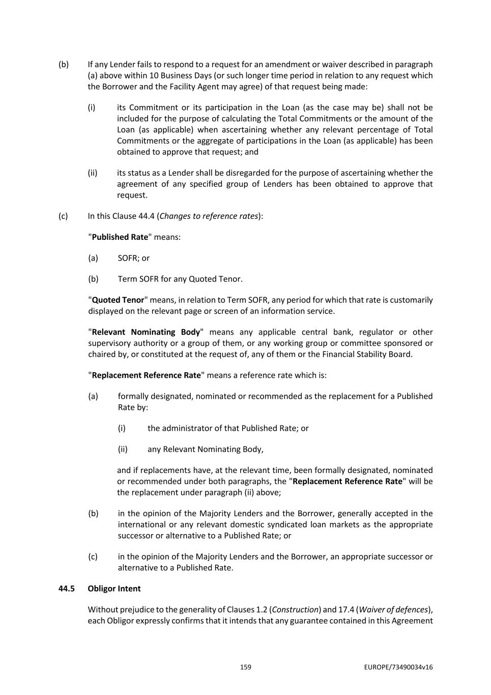 159 EUROPE/73490034v16 (b) If any Lender fails to respond to a request for an amendment or waiver described in paragraph (a) above within 10 Business Days (or such longer time period in relation to any request which the Borrower and the Facility Agent may agree) of that request being made: (i) its Commitment or its participation in the Loan (as the case may be) shall not be included for the purpose of calculating the Total Commitments or the amount of the Loan (as applicable) when ascertaining whether any relevant percentage of Total Commitments or the aggregate of participations in the Loan (as applicable) has been obtained to approve that request; and (ii) its status as a Lender shall be disregarded for the purpose of ascertaining whether the agreement of any specified group of Lenders has been obtained to approve that request. (c) In this Clause 44.4 (Changes to reference rates): "Published Rate" means: (a) SOFR; or (b) Term SOFR for any Quoted Tenor. "Quoted Tenor" means, in relation to Term SOFR, any period for which that rate is customarily displayed on the relevant page or screen of an information service. "Relevant Nominating Body" means any applicable central bank, regulator or other supervisory authority or a group of them, or any working group or committee sponsored or chaired by, or constituted at the request of, any of them or the Financial Stability Board. "Replacement Reference Rate" means a reference rate which is: (a) formally designated, nominated or recommended as the replacement for a Published Rate by: (i) the administrator of that Published Rate; or (ii) any Relevant Nominating Body, and if replacements have, at the relevant time, been formally designated, nominated or recommended under both paragraphs, the "Replacement Reference Rate" will be the replacement under paragraph (ii) above; (b) in the opinion of the Majority Lenders and the Borrower, generally accepted in the international or any relevant domestic syndicated loan markets as the appropriate successor or alternative to a Published Rate; or (c) in the opinion of the Majority Lenders and the Borrower, an appropriate successor or alternative to a Published Rate. 44.5 Obligor Intent Without prejudice to the generality of Clauses 1.2 (Construction) and 17.4 (Waiver of defences), each Obligor expressly confirms that it intends that any guarantee contained in this Agreement