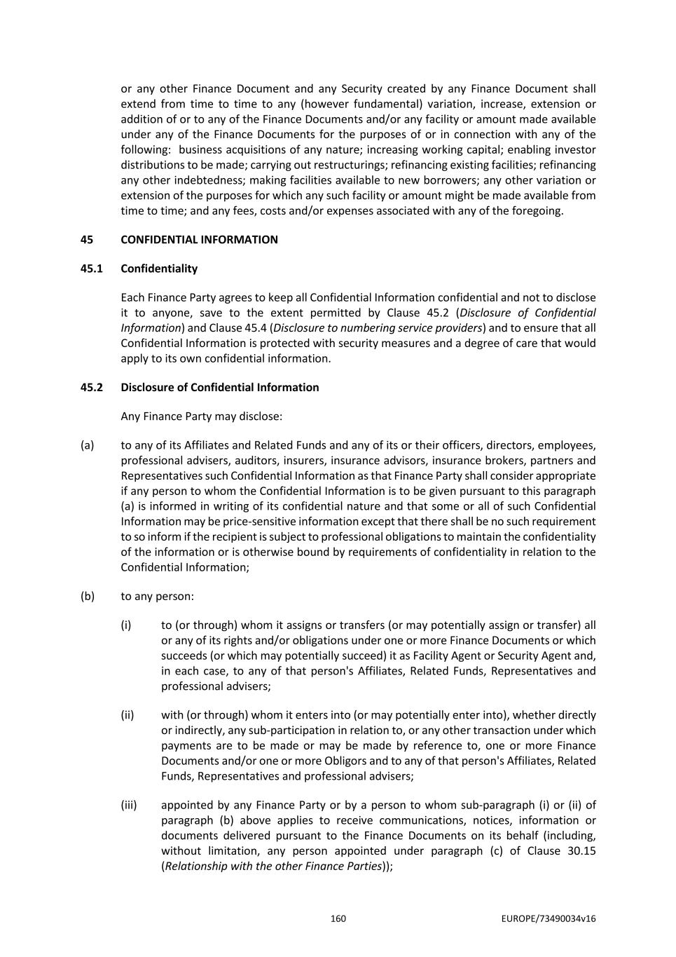 160 EUROPE/73490034v16 or any other Finance Document and any Security created by any Finance Document shall extend from time to time to any (however fundamental) variation, increase, extension or addition of or to any of the Finance Documents and/or any facility or amount made available under any of the Finance Documents for the purposes of or in connection with any of the following: business acquisitions of any nature; increasing working capital; enabling investor distributions to be made; carrying out restructurings; refinancing existing facilities; refinancing any other indebtedness; making facilities available to new borrowers; any other variation or extension of the purposes for which any such facility or amount might be made available from time to time; and any fees, costs and/or expenses associated with any of the foregoing. 45 CONFIDENTIAL INFORMATION 45.1 Confidentiality Each Finance Party agrees to keep all Confidential Information confidential and not to disclose it to anyone, save to the extent permitted by Clause 45.2 (Disclosure of Confidential Information) and Clause 45.4 (Disclosure to numbering service providers) and to ensure that all Confidential Information is protected with security measures and a degree of care that would apply to its own confidential information. 45.2 Disclosure of Confidential Information Any Finance Party may disclose: (a) to any of its Affiliates and Related Funds and any of its or their officers, directors, employees, professional advisers, auditors, insurers, insurance advisors, insurance brokers, partners and Representatives such Confidential Information as that Finance Party shall consider appropriate if any person to whom the Confidential Information is to be given pursuant to this paragraph (a) is informed in writing of its confidential nature and that some or all of such Confidential Information may be price-sensitive information except that there shall be no such requirement to so inform if the recipient is subject to professional obligations to maintain the confidentiality of the information or is otherwise bound by requirements of confidentiality in relation to the Confidential Information; (b) to any person: (i) to (or through) whom it assigns or transfers (or may potentially assign or transfer) all or any of its rights and/or obligations under one or more Finance Documents or which succeeds (or which may potentially succeed) it as Facility Agent or Security Agent and, in each case, to any of that person's Affiliates, Related Funds, Representatives and professional advisers; (ii) with (or through) whom it enters into (or may potentially enter into), whether directly or indirectly, any sub-participation in relation to, or any other transaction under which payments are to be made or may be made by reference to, one or more Finance Documents and/or one or more Obligors and to any of that person's Affiliates, Related Funds, Representatives and professional advisers; (iii) appointed by any Finance Party or by a person to whom sub-paragraph (i) or (ii) of paragraph (b) above applies to receive communications, notices, information or documents delivered pursuant to the Finance Documents on its behalf (including, without limitation, any person appointed under paragraph (c) of Clause 30.15 (Relationship with the other Finance Parties));
