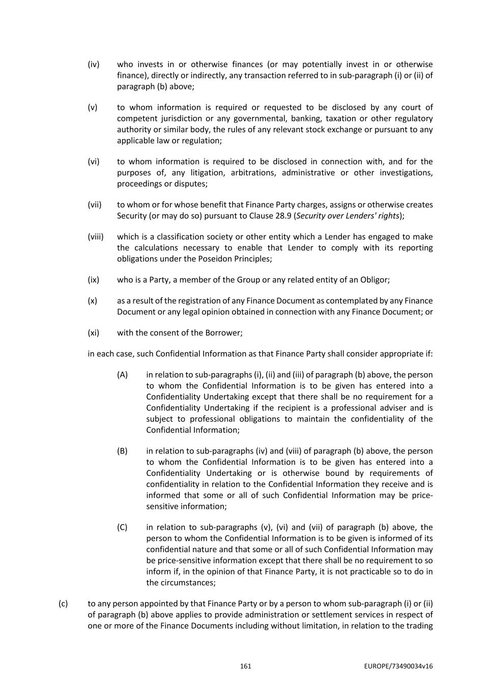 161 EUROPE/73490034v16 (iv) who invests in or otherwise finances (or may potentially invest in or otherwise finance), directly or indirectly, any transaction referred to in sub-paragraph (i) or (ii) of paragraph (b) above; (v) to whom information is required or requested to be disclosed by any court of competent jurisdiction or any governmental, banking, taxation or other regulatory authority or similar body, the rules of any relevant stock exchange or pursuant to any applicable law or regulation; (vi) to whom information is required to be disclosed in connection with, and for the purposes of, any litigation, arbitrations, administrative or other investigations, proceedings or disputes; (vii) to whom or for whose benefit that Finance Party charges, assigns or otherwise creates Security (or may do so) pursuant to Clause 28.9 (Security over Lenders' rights); (viii) which is a classification society or other entity which a Lender has engaged to make the calculations necessary to enable that Lender to comply with its reporting obligations under the Poseidon Principles; (ix) who is a Party, a member of the Group or any related entity of an Obligor; (x) as a result of the registration of any Finance Document as contemplated by any Finance Document or any legal opinion obtained in connection with any Finance Document; or (xi) with the consent of the Borrower; in each case, such Confidential Information as that Finance Party shall consider appropriate if: (A) in relation to sub-paragraphs (i), (ii) and (iii) of paragraph (b) above, the person to whom the Confidential Information is to be given has entered into a Confidentiality Undertaking except that there shall be no requirement for a Confidentiality Undertaking if the recipient is a professional adviser and is subject to professional obligations to maintain the confidentiality of the Confidential Information; (B) in relation to sub-paragraphs (iv) and (viii) of paragraph (b) above, the person to whom the Confidential Information is to be given has entered into a Confidentiality Undertaking or is otherwise bound by requirements of confidentiality in relation to the Confidential Information they receive and is informed that some or all of such Confidential Information may be price- sensitive information; (C) in relation to sub-paragraphs (v), (vi) and (vii) of paragraph (b) above, the person to whom the Confidential Information is to be given is informed of its confidential nature and that some or all of such Confidential Information may be price-sensitive information except that there shall be no requirement to so inform if, in the opinion of that Finance Party, it is not practicable so to do in the circumstances; (c) to any person appointed by that Finance Party or by a person to whom sub-paragraph (i) or (ii) of paragraph (b) above applies to provide administration or settlement services in respect of one or more of the Finance Documents including without limitation, in relation to the trading
