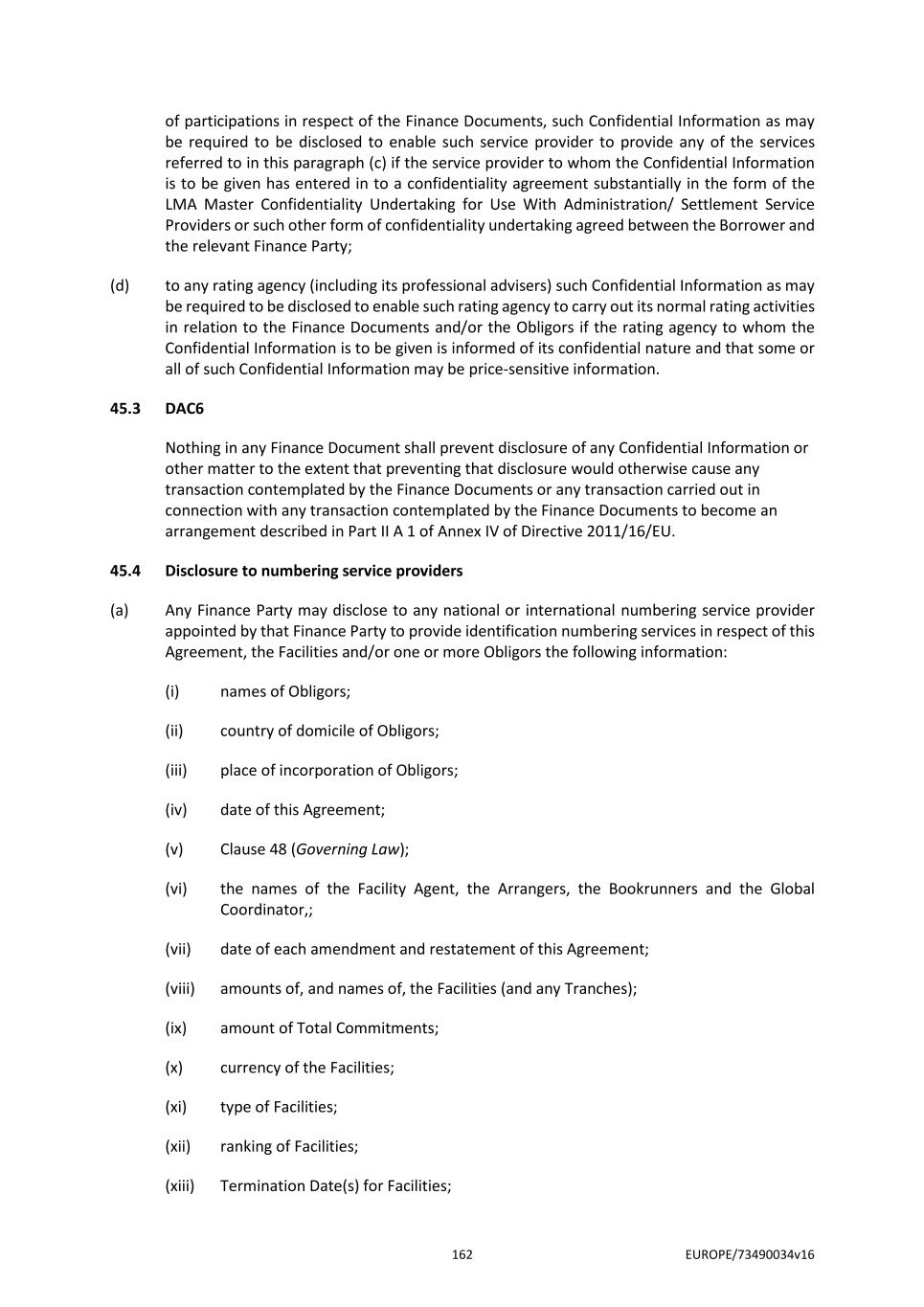 162 EUROPE/73490034v16 of participations in respect of the Finance Documents, such Confidential Information as may be required to be disclosed to enable such service provider to provide any of the services referred to in this paragraph (c) if the service provider to whom the Confidential Information is to be given has entered in to a confidentiality agreement substantially in the form of the LMA Master Confidentiality Undertaking for Use With Administration/ Settlement Service Providers or such other form of confidentiality undertaking agreed between the Borrower and the relevant Finance Party; (d) to any rating agency (including its professional advisers) such Confidential Information as may be required to be disclosed to enable such rating agency to carry out its normal rating activities in relation to the Finance Documents and/or the Obligors if the rating agency to whom the Confidential Information is to be given is informed of its confidential nature and that some or all of such Confidential Information may be price-sensitive information. 45.3 DAC6 Nothing in any Finance Document shall prevent disclosure of any Confidential Information or other matter to the extent that preventing that disclosure would otherwise cause any transaction contemplated by the Finance Documents or any transaction carried out in connection with any transaction contemplated by the Finance Documents to become an arrangement described in Part II A 1 of Annex IV of Directive 2011/16/EU. 45.4 Disclosure to numbering service providers (a) Any Finance Party may disclose to any national or international numbering service provider appointed by that Finance Party to provide identification numbering services in respect of this Agreement, the Facilities and/or one or more Obligors the following information: (i) names of Obligors; (ii) country of domicile of Obligors; (iii) place of incorporation of Obligors; (iv) date of this Agreement; (v) Clause 48 (Governing Law); (vi) the names of the Facility Agent, the Arrangers, the Bookrunners and the Global Coordinator,; (vii) date of each amendment and restatement of this Agreement; (viii) amounts of, and names of, the Facilities (and any Tranches); (ix) amount of Total Commitments; (x) currency of the Facilities; (xi) type of Facilities; (xii) ranking of Facilities; (xiii) Termination Date(s) for Facilities;
