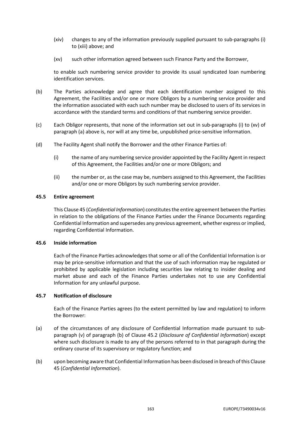 163 EUROPE/73490034v16 (xiv) changes to any of the information previously supplied pursuant to sub-paragraphs (i) to (xiii) above; and (xv) such other information agreed between such Finance Party and the Borrower, to enable such numbering service provider to provide its usual syndicated loan numbering identification services. (b) The Parties acknowledge and agree that each identification number assigned to this Agreement, the Facilities and/or one or more Obligors by a numbering service provider and the information associated with each such number may be disclosed to users of its services in accordance with the standard terms and conditions of that numbering service provider. (c) Each Obligor represents, that none of the information set out in sub-paragraphs (i) to (xv) of paragraph (a) above is, nor will at any time be, unpublished price-sensitive information. (d) The Facility Agent shall notify the Borrower and the other Finance Parties of: (i) the name of any numbering service provider appointed by the Facility Agent in respect of this Agreement, the Facilities and/or one or more Obligors; and (ii) the number or, as the case may be, numbers assigned to this Agreement, the Facilities and/or one or more Obligors by such numbering service provider. 45.5 Entire agreement This Clause 45 (Confidential Information) constitutes the entire agreement between the Parties in relation to the obligations of the Finance Parties under the Finance Documents regarding Confidential Information and supersedes any previous agreement, whether express or implied, regarding Confidential Information. 45.6 Inside information Each of the Finance Parties acknowledges that some or all of the Confidential Information is or may be price-sensitive information and that the use of such information may be regulated or prohibited by applicable legislation including securities law relating to insider dealing and market abuse and each of the Finance Parties undertakes not to use any Confidential Information for any unlawful purpose. 45.7 Notification of disclosure Each of the Finance Parties agrees (to the extent permitted by law and regulation) to inform the Borrower: (a) of the circumstances of any disclosure of Confidential Information made pursuant to sub- paragraph (v) of paragraph (b) of Clause 45.2 (Disclosure of Confidential Information) except where such disclosure is made to any of the persons referred to in that paragraph during the ordinary course of its supervisory or regulatory function; and (b) upon becoming aware that Confidential Information has been disclosed in breach of this Clause 45 (Confidential Information).