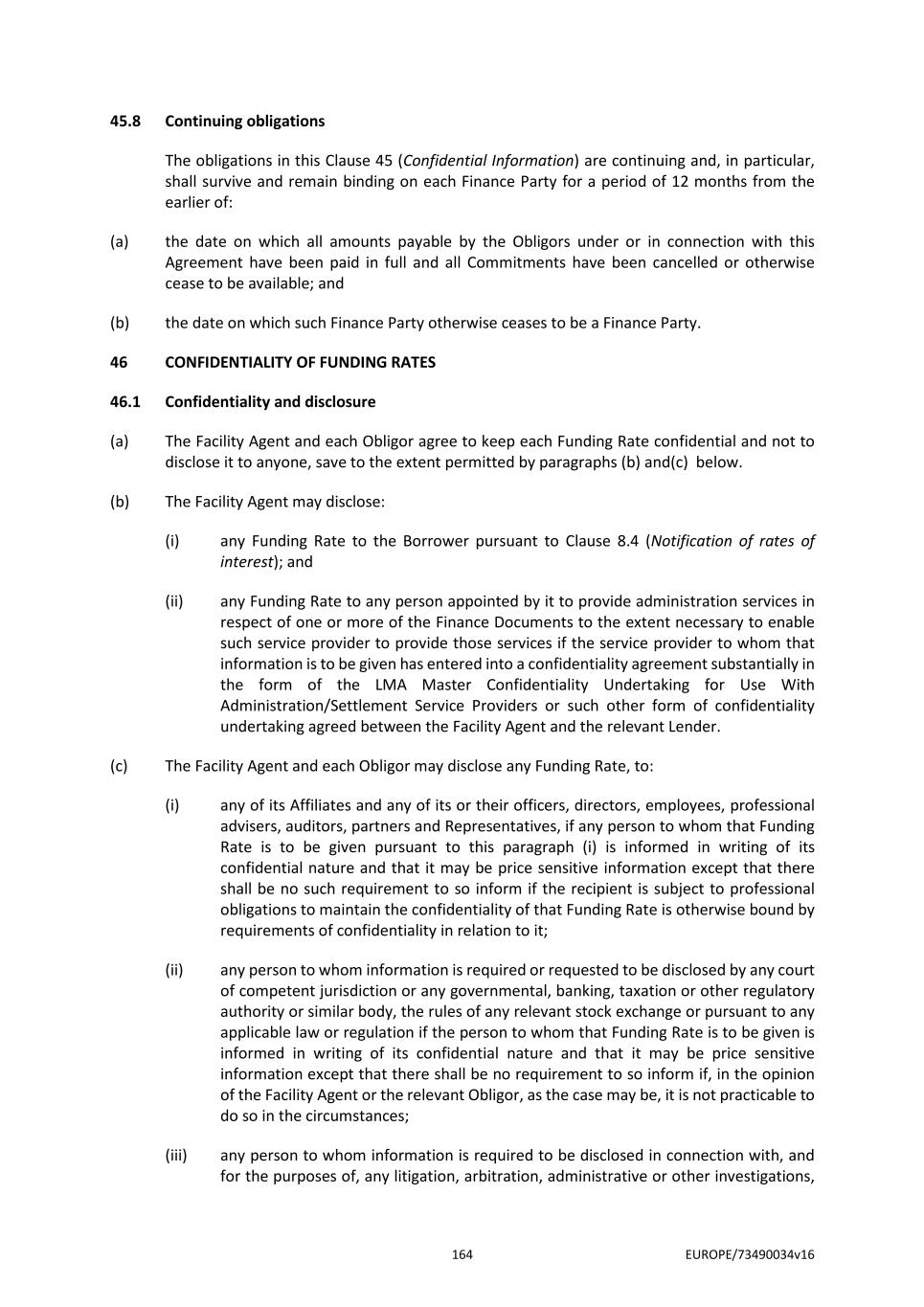 164 EUROPE/73490034v16 45.8 Continuing obligations The obligations in this Clause 45 (Confidential Information) are continuing and, in particular, shall survive and remain binding on each Finance Party for a period of 12 months from the earlier of: (a) the date on which all amounts payable by the Obligors under or in connection with this Agreement have been paid in full and all Commitments have been cancelled or otherwise cease to be available; and (b) the date on which such Finance Party otherwise ceases to be a Finance Party. 46 CONFIDENTIALITY OF FUNDING RATES 46.1 Confidentiality and disclosure (a) The Facility Agent and each Obligor agree to keep each Funding Rate confidential and not to disclose it to anyone, save to the extent permitted by paragraphs (b) and(c) below. (b) The Facility Agent may disclose: (i) any Funding Rate to the Borrower pursuant to Clause 8.4 (Notification of rates of interest); and (ii) any Funding Rate to any person appointed by it to provide administration services in respect of one or more of the Finance Documents to the extent necessary to enable such service provider to provide those services if the service provider to whom that information is to be given has entered into a confidentiality agreement substantially in the form of the LMA Master Confidentiality Undertaking for Use With Administration/Settlement Service Providers or such other form of confidentiality undertaking agreed between the Facility Agent and the relevant Lender. (c) The Facility Agent and each Obligor may disclose any Funding Rate, to: (i) any of its Affiliates and any of its or their officers, directors, employees, professional advisers, auditors, partners and Representatives, if any person to whom that Funding Rate is to be given pursuant to this paragraph (i) is informed in writing of its confidential nature and that it may be price sensitive information except that there shall be no such requirement to so inform if the recipient is subject to professional obligations to maintain the confidentiality of that Funding Rate is otherwise bound by requirements of confidentiality in relation to it; (ii) any person to whom information is required or requested to be disclosed by any court of competent jurisdiction or any governmental, banking, taxation or other regulatory authority or similar body, the rules of any relevant stock exchange or pursuant to any applicable law or regulation if the person to whom that Funding Rate is to be given is informed in writing of its confidential nature and that it may be price sensitive information except that there shall be no requirement to so inform if, in the opinion of the Facility Agent or the relevant Obligor, as the case may be, it is not practicable to do so in the circumstances; (iii) any person to whom information is required to be disclosed in connection with, and for the purposes of, any litigation, arbitration, administrative or other investigations,