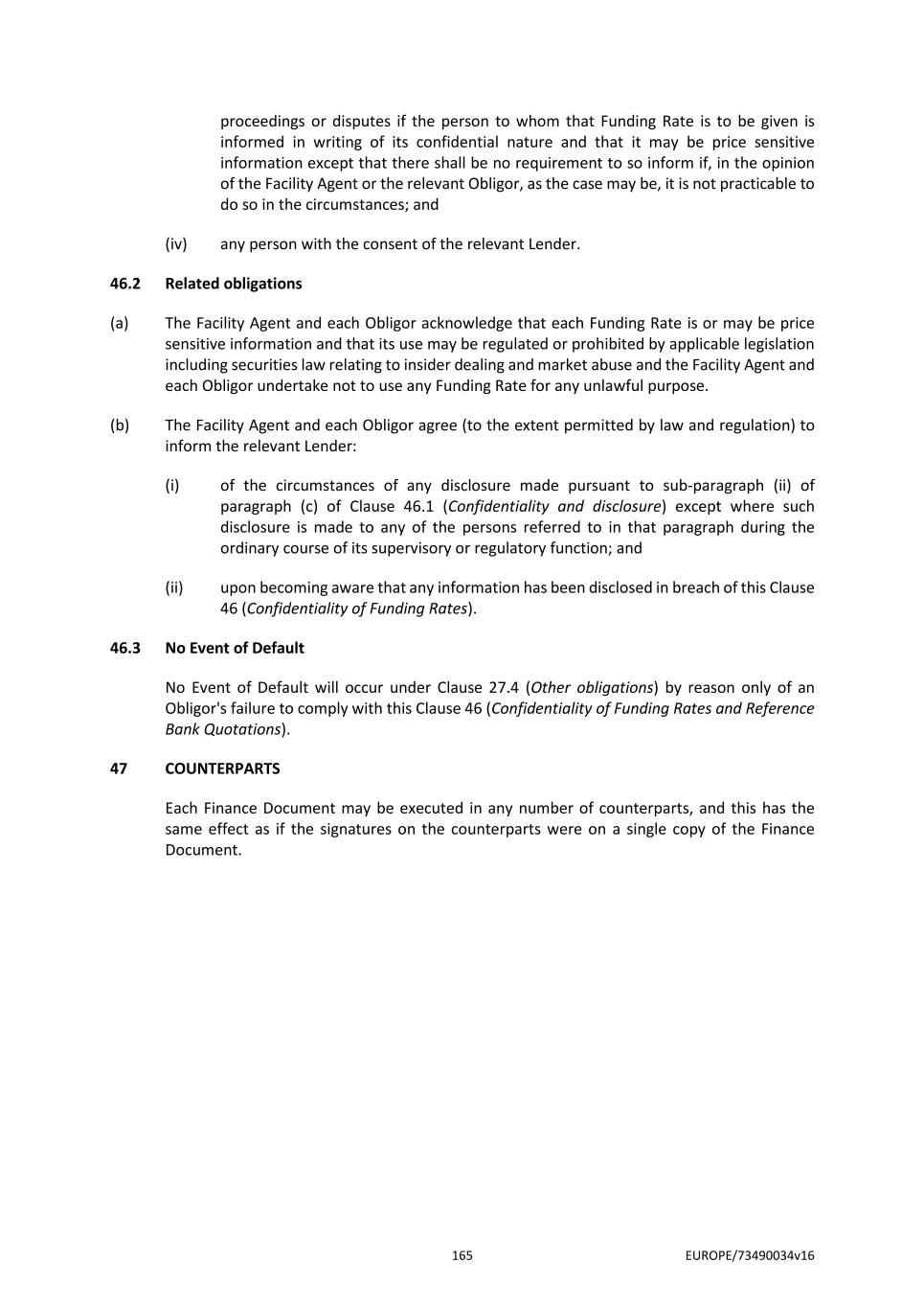 165 EUROPE/73490034v16 proceedings or disputes if the person to whom that Funding Rate is to be given is informed in writing of its confidential nature and that it may be price sensitive information except that there shall be no requirement to so inform if, in the opinion of the Facility Agent or the relevant Obligor, as the case may be, it is not practicable to do so in the circumstances; and (iv) any person with the consent of the relevant Lender. 46.2 Related obligations (a) The Facility Agent and each Obligor acknowledge that each Funding Rate is or may be price sensitive information and that its use may be regulated or prohibited by applicable legislation including securities law relating to insider dealing and market abuse and the Facility Agent and each Obligor undertake not to use any Funding Rate for any unlawful purpose. (b) The Facility Agent and each Obligor agree (to the extent permitted by law and regulation) to inform the relevant Lender: (i) of the circumstances of any disclosure made pursuant to sub-paragraph (ii) of paragraph (c) of Clause 46.1 (Confidentiality and disclosure) except where such disclosure is made to any of the persons referred to in that paragraph during the ordinary course of its supervisory or regulatory function; and (ii) upon becoming aware that any information has been disclosed in breach of this Clause 46 (Confidentiality of Funding Rates). 46.3 No Event of Default No Event of Default will occur under Clause 27.4 (Other obligations) by reason only of an Obligor's failure to comply with this Clause 46 (Confidentiality of Funding Rates and Reference Bank Quotations). 47 COUNTERPARTS Each Finance Document may be executed in any number of counterparts, and this has the same effect as if the signatures on the counterparts were on a single copy of the Finance Document.