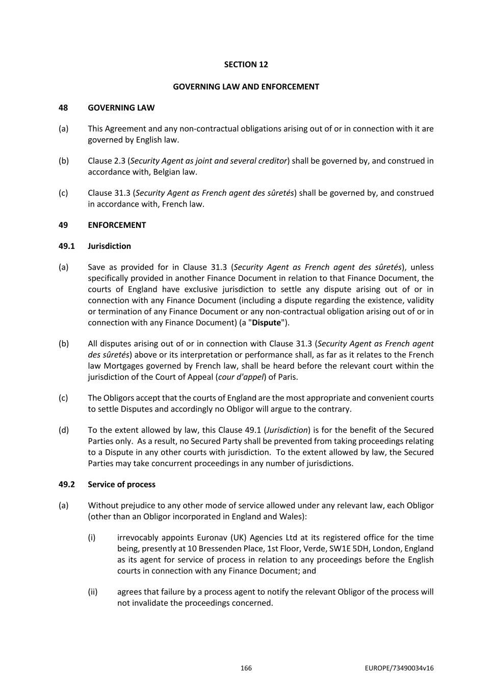 166 EUROPE/73490034v16 SECTION 12 GOVERNING LAW AND ENFORCEMENT 48 GOVERNING LAW (a) This Agreement and any non-contractual obligations arising out of or in connection with it are governed by English law. (b) Clause 2.3 (Security Agent as joint and several creditor) shall be governed by, and construed in accordance with, Belgian law. (c) Clause 31.3 (Security Agent as French agent des sûretés) shall be governed by, and construed in accordance with, French law. 49 ENFORCEMENT 49.1 Jurisdiction (a) Save as provided for in Clause 31.3 (Security Agent as French agent des sûretés), unless specifically provided in another Finance Document in relation to that Finance Document, the courts of England have exclusive jurisdiction to settle any dispute arising out of or in connection with any Finance Document (including a dispute regarding the existence, validity or termination of any Finance Document or any non-contractual obligation arising out of or in connection with any Finance Document) (a "Dispute"). (b) All disputes arising out of or in connection with Clause 31.3 (Security Agent as French agent des sûretés) above or its interpretation or performance shall, as far as it relates to the French law Mortgages governed by French law, shall be heard before the relevant court within the jurisdiction of the Court of Appeal (cour d'appel) of Paris. (c) The Obligors accept that the courts of England are the most appropriate and convenient courts to settle Disputes and accordingly no Obligor will argue to the contrary. (d) To the extent allowed by law, this Clause 49.1 (Jurisdiction) is for the benefit of the Secured Parties only. As a result, no Secured Party shall be prevented from taking proceedings relating to a Dispute in any other courts with jurisdiction. To the extent allowed by law, the Secured Parties may take concurrent proceedings in any number of jurisdictions. 49.2 Service of process (a) Without prejudice to any other mode of service allowed under any relevant law, each Obligor (other than an Obligor incorporated in England and Wales): (i) irrevocably appoints Euronav (UK) Agencies Ltd at its registered office for the time being, presently at 10 Bressenden Place, 1st Floor, Verde, SW1E 5DH, London, England as its agent for service of process in relation to any proceedings before the English courts in connection with any Finance Document; and (ii) agrees that failure by a process agent to notify the relevant Obligor of the process will not invalidate the proceedings concerned.