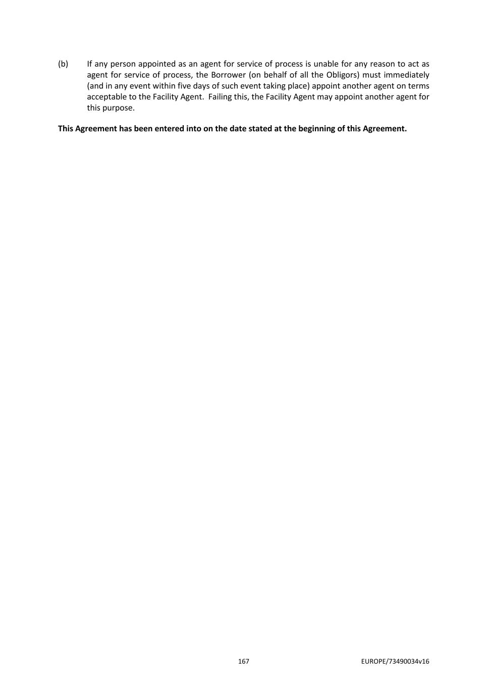 167 EUROPE/73490034v16 (b) If any person appointed as an agent for service of process is unable for any reason to act as agent for service of process, the Borrower (on behalf of all the Obligors) must immediately (and in any event within five days of such event taking place) appoint another agent on terms acceptable to the Facility Agent. Failing this, the Facility Agent may appoint another agent for this purpose. This Agreement has been entered into on the date stated at the beginning of this Agreement.
