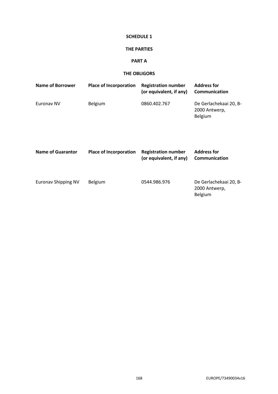 168 EUROPE/73490034v16 SCHEDULE 1 THE PARTIES PART A THE OBLIGORS Name of Borrower Place of Incorporation Registration number (or equivalent, if any) Address for Communication Euronav NV Belgium 0860.402.767 De Gerlachekaai 20, B- 2000 Antwerp, Belgium Name of Guarantor Place of Incorporation Registration number (or equivalent, if any) Address for Communication Euronav Shipping NV Belgium 0544.986.976 De Gerlachekaai 20, B- 2000 Antwerp, Belgium
