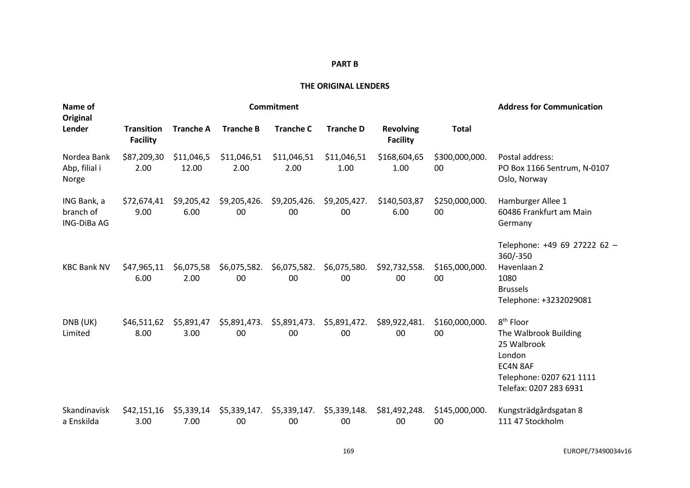 169 EUROPE/73490034v16 PART B THE ORIGINAL LENDERS Name of Original Lender Commitment Address for Communication Transition Facility Tranche A Tranche B Tranche C Tranche D Revolving Facility Total Nordea Bank Abp, filial i Norge $87,209,30 2.00 $11,046,5 12.00 $11,046,51 2.00 $11,046,51 2.00 $11,046,51 1.00 $168,604,65 1.00 $300,000,000. 00 Postal address: PO Box 1166 Sentrum, N-0107 Oslo, Norway ING Bank, a branch of ING-DiBa AG $72,674,41 9.00 $9,205,42 6.00 $9,205,426. 00 $9,205,426. 00 $9,205,427. 00 $140,503,87 6.00 $250,000,000. 00 Hamburger Allee 1 60486 Frankfurt am Main Germany Telephone: +49 69 27222 62 – 360/-350 KBC Bank NV $47,965,11 6.00 $6,075,58 2.00 $6,075,582. 00 $6,075,582. 00 $6,075,580. 00 $92,732,558. 00 $165,000,000. 00 Havenlaan 2 1080 Brussels Telephone: +3232029081 DNB (UK) Limited $46,511,62 8.00 $5,891,47 3.00 $5,891,473. 00 $5,891,473. 00 $5,891,472. 00 $89,922,481. 00 $160,000,000. 00 8th Floor The Walbrook Building 25 Walbrook London EC4N 8AF Telephone: 0207 621 1111 Telefax: 0207 283 6931 Skandinavisk a Enskilda $42,151,16 3.00 $5,339,14 7.00 $5,339,147. 00 $5,339,147. 00 $5,339,148. 00 $81,492,248. 00 $145,000,000. 00 Kungsträdgårdsgatan 8 111 47 Stockholm