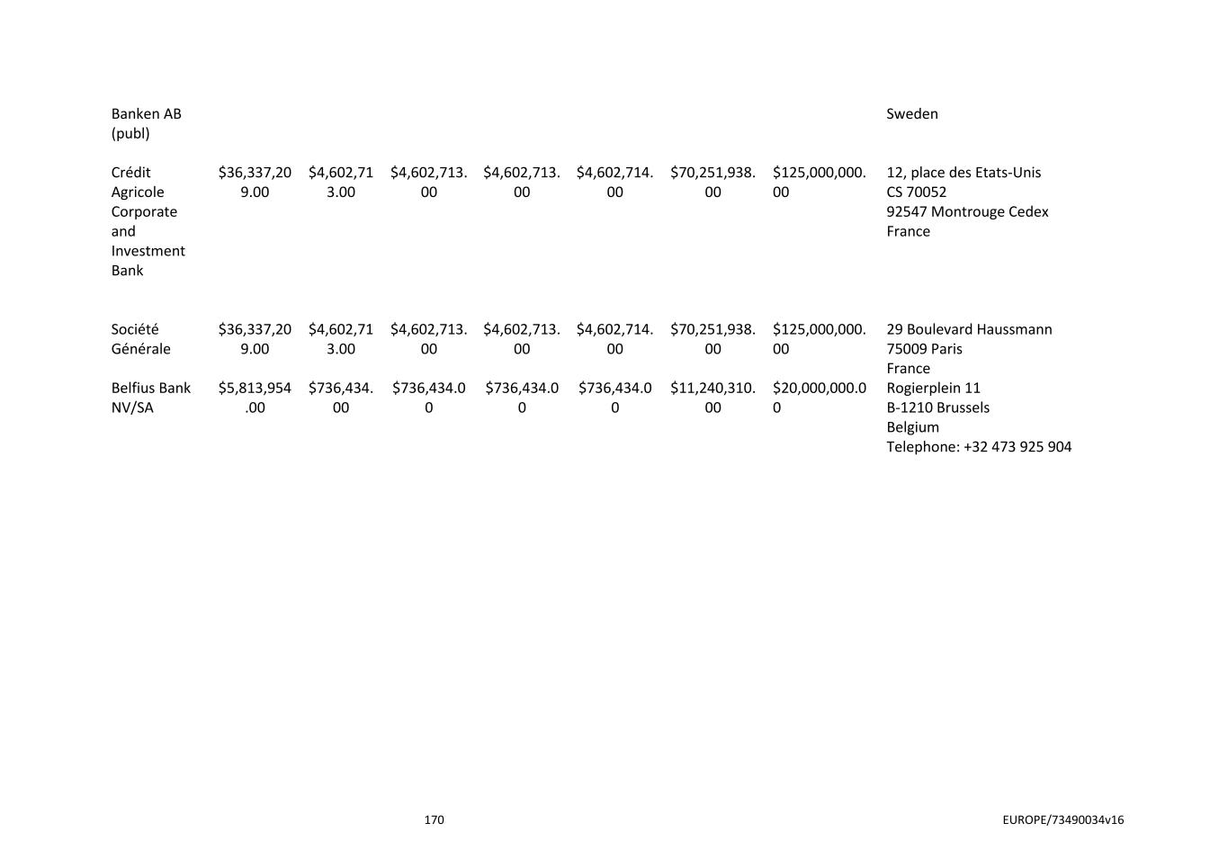 170 EUROPE/73490034v16 Banken AB (publ) Sweden Crédit Agricole Corporate and Investment Bank $36,337,20 9.00 $4,602,71 3.00 $4,602,713. 00 $4,602,713. 00 $4,602,714. 00 $70,251,938. 00 $125,000,000. 00 12, place des Etats-Unis CS 70052 92547 Montrouge Cedex France Société Générale $36,337,20 9.00 $4,602,71 3.00 $4,602,713. 00 $4,602,713. 00 $4,602,714. 00 $70,251,938. 00 $125,000,000. 00 29 Boulevard Haussmann 75009 Paris France Belfius Bank NV/SA $5,813,954 .00 $736,434. 00 $736,434.0 0 $736,434.0 0 $736,434.0 0 $11,240,310. 00 $20,000,000.0 0 Rogierplein 11 B-1210 Brussels Belgium Telephone: +32 473 925 904