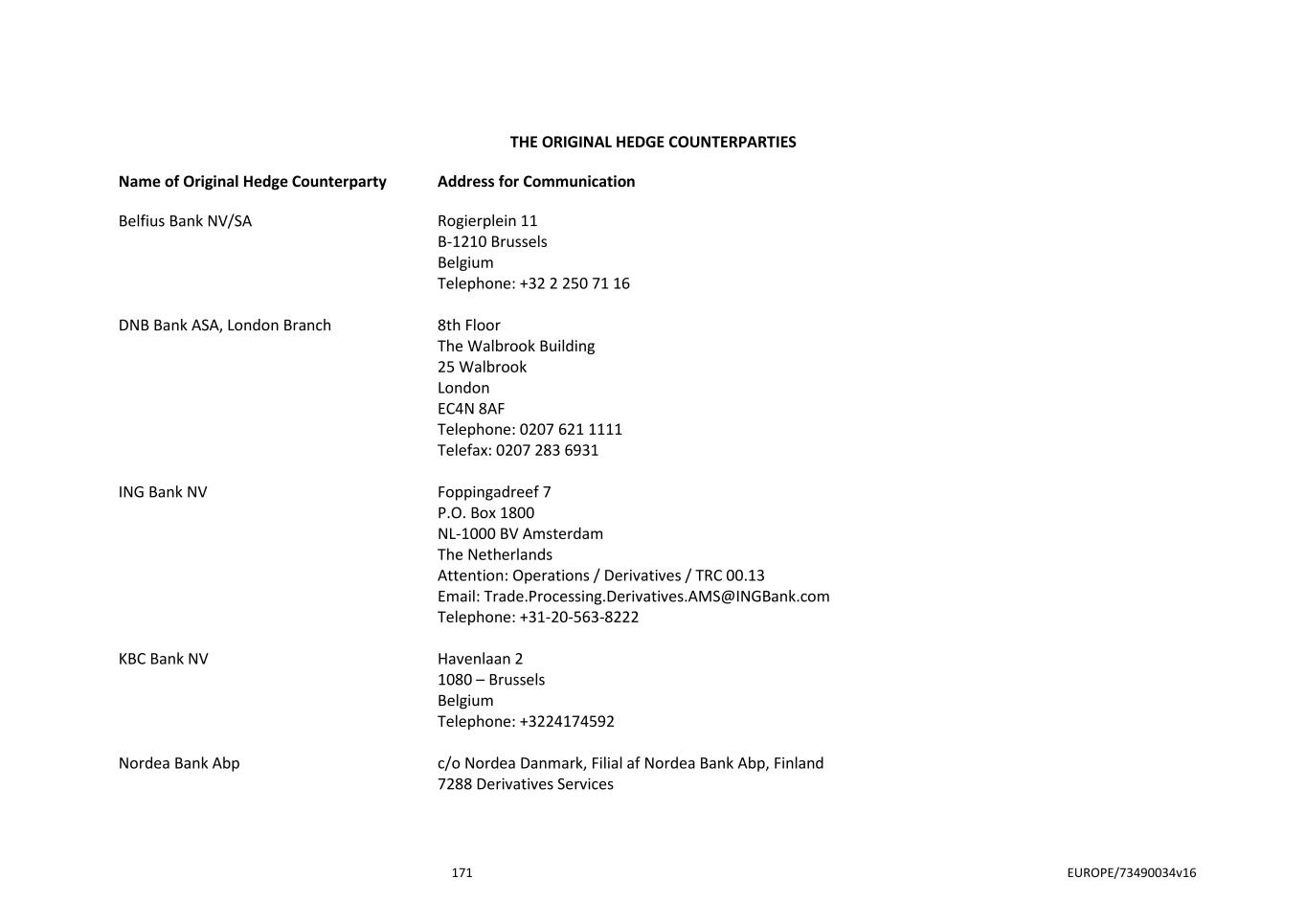 171 EUROPE/73490034v16 THE ORIGINAL HEDGE COUNTERPARTIES Name of Original Hedge Counterparty Address for Communication Belfius Bank NV/SA Rogierplein 11 B-1210 Brussels Belgium Telephone: +32 2 250 71 16 DNB Bank ASA, London Branch 8th Floor The Walbrook Building 25 Walbrook London EC4N 8AF Telephone: 0207 621 1111 Telefax: 0207 283 6931 ING Bank NV Foppingadreef 7 P.O. Box 1800 NL-1000 BV Amsterdam The Netherlands Attention: Operations / Derivatives / TRC 00.13 Email: Trade.Processing.Derivatives.AMS@INGBank.com Telephone: +31-20-563-8222 KBC Bank NV Havenlaan 2 1080 – Brussels Belgium Telephone: +3224174592 Nordea Bank Abp c/o Nordea Danmark, Filial af Nordea Bank Abp, Finland 7288 Derivatives Services
