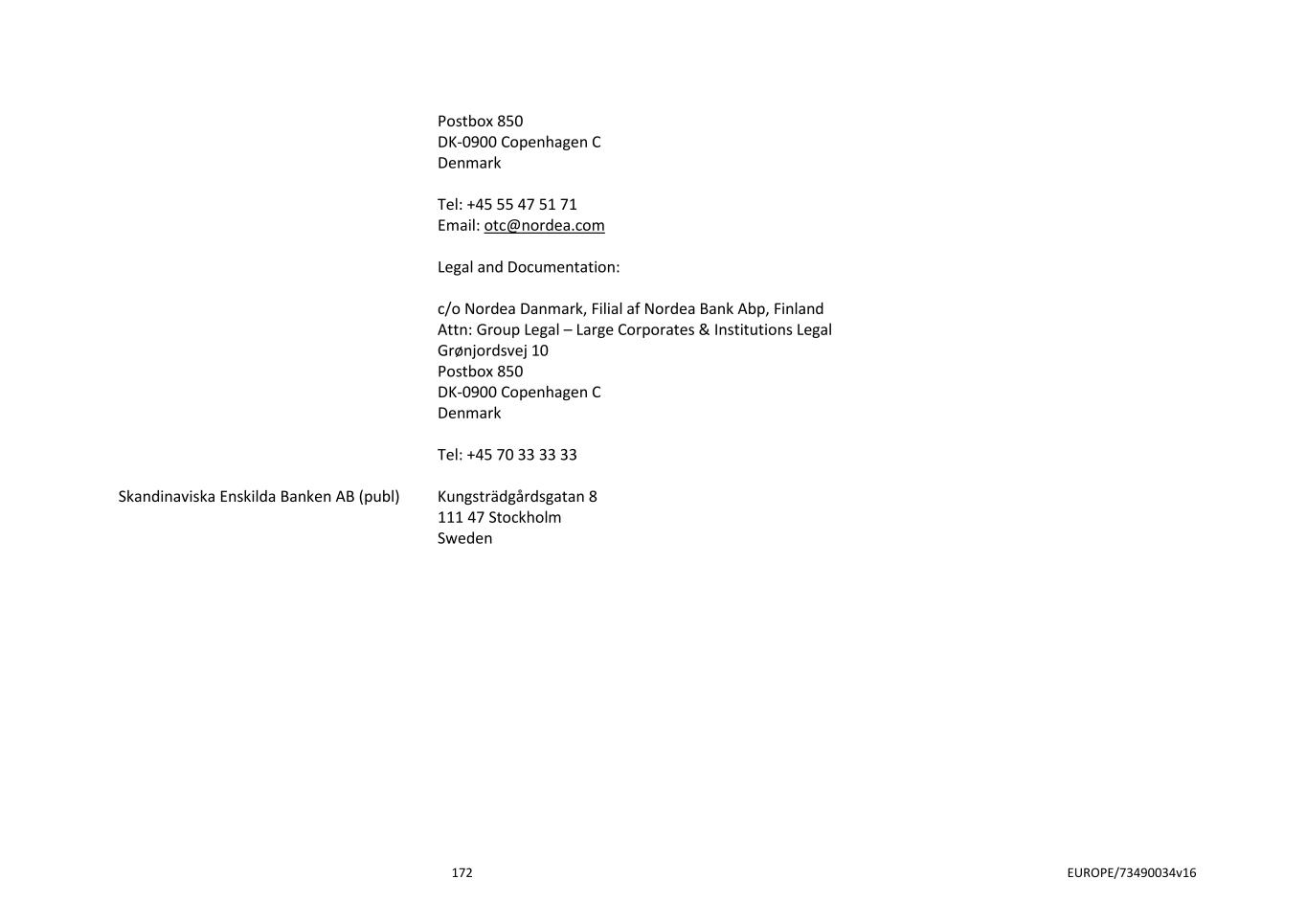 172 EUROPE/73490034v16 Postbox 850 DK-0900 Copenhagen C Denmark Tel: +45 55 47 51 71 Email: otc@nordea.com Legal and Documentation: c/o Nordea Danmark, Filial af Nordea Bank Abp, Finland Attn: Group Legal – Large Corporates & Institutions Legal Grønjordsvej 10 Postbox 850 DK-0900 Copenhagen C Denmark Tel: +45 70 33 33 33 Skandinaviska Enskilda Banken AB (publ) Kungsträdgårdsgatan 8 111 47 Stockholm Sweden