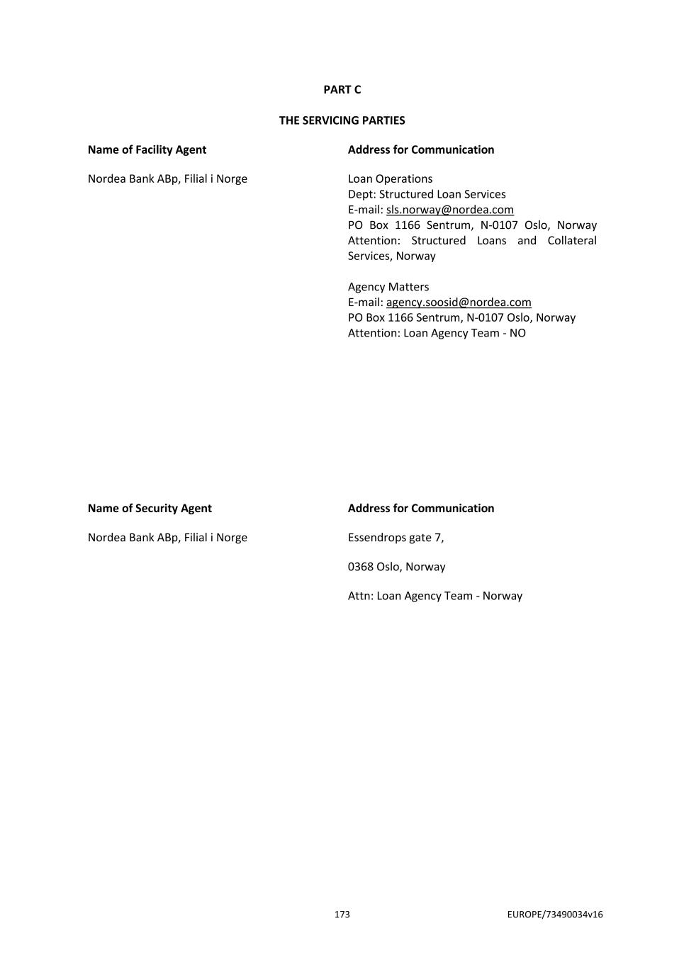 173 EUROPE/73490034v16 PART C THE SERVICING PARTIES Name of Facility Agent Address for Communication Nordea Bank ABp, Filial i Norge Loan Operations Dept: Structured Loan Services E-mail: sls.norway@nordea.com PO Box 1166 Sentrum, N-0107 Oslo, Norway Attention: Structured Loans and Collateral Services, Norway Agency Matters E-mail: agency.soosid@nordea.com PO Box 1166 Sentrum, N-0107 Oslo, Norway Attention: Loan Agency Team - NO Name of Security Agent Address for Communication Nordea Bank ABp, Filial i Norge Essendrops gate 7, 0368 Oslo, Norway Attn: Loan Agency Team - Norway