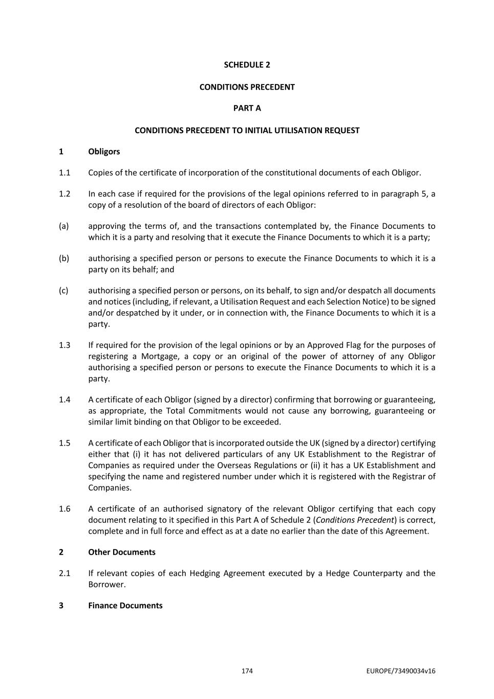 174 EUROPE/73490034v16 SCHEDULE 2 CONDITIONS PRECEDENT PART A CONDITIONS PRECEDENT TO INITIAL UTILISATION REQUEST 1 Obligors 1.1 Copies of the certificate of incorporation of the constitutional documents of each Obligor. 1.2 In each case if required for the provisions of the legal opinions referred to in paragraph 5, a copy of a resolution of the board of directors of each Obligor: (a) approving the terms of, and the transactions contemplated by, the Finance Documents to which it is a party and resolving that it execute the Finance Documents to which it is a party; (b) authorising a specified person or persons to execute the Finance Documents to which it is a party on its behalf; and (c) authorising a specified person or persons, on its behalf, to sign and/or despatch all documents and notices (including, if relevant, a Utilisation Request and each Selection Notice) to be signed and/or despatched by it under, or in connection with, the Finance Documents to which it is a party. 1.3 If required for the provision of the legal opinions or by an Approved Flag for the purposes of registering a Mortgage, a copy or an original of the power of attorney of any Obligor authorising a specified person or persons to execute the Finance Documents to which it is a party. 1.4 A certificate of each Obligor (signed by a director) confirming that borrowing or guaranteeing, as appropriate, the Total Commitments would not cause any borrowing, guaranteeing or similar limit binding on that Obligor to be exceeded. 1.5 A certificate of each Obligor that is incorporated outside the UK (signed by a director) certifying either that (i) it has not delivered particulars of any UK Establishment to the Registrar of Companies as required under the Overseas Regulations or (ii) it has a UK Establishment and specifying the name and registered number under which it is registered with the Registrar of Companies. 1.6 A certificate of an authorised signatory of the relevant Obligor certifying that each copy document relating to it specified in this Part A of Schedule 2 (Conditions Precedent) is correct, complete and in full force and effect as at a date no earlier than the date of this Agreement. 2 Other Documents 2.1 If relevant copies of each Hedging Agreement executed by a Hedge Counterparty and the Borrower. 3 Finance Documents