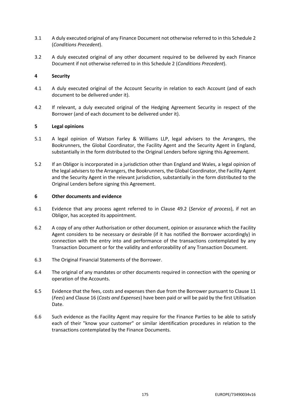 175 EUROPE/73490034v16 3.1 A duly executed original of any Finance Document not otherwise referred to in this Schedule 2 (Conditions Precedent). 3.2 A duly executed original of any other document required to be delivered by each Finance Document if not otherwise referred to in this Schedule 2 (Conditions Precedent). 4 Security 4.1 A duly executed original of the Account Security in relation to each Account (and of each document to be delivered under it). 4.2 If relevant, a duly executed original of the Hedging Agreement Security in respect of the Borrower (and of each document to be delivered under it). 5 Legal opinions 5.1 A legal opinion of Watson Farley & Williams LLP, legal advisers to the Arrangers, the Bookrunners, the Global Coordinator, the Facility Agent and the Security Agent in England, substantially in the form distributed to the Original Lenders before signing this Agreement. 5.2 If an Obligor is incorporated in a jurisdiction other than England and Wales, a legal opinion of the legal advisers to the Arrangers, the Bookrunners, the Global Coordinator, the Facility Agent and the Security Agent in the relevant jurisdiction, substantially in the form distributed to the Original Lenders before signing this Agreement. 6 Other documents and evidence 6.1 Evidence that any process agent referred to in Clause 49.2 (Service of process), if not an Obligor, has accepted its appointment. 6.2 A copy of any other Authorisation or other document, opinion or assurance which the Facility Agent considers to be necessary or desirable (if it has notified the Borrower accordingly) in connection with the entry into and performance of the transactions contemplated by any Transaction Document or for the validity and enforceability of any Transaction Document. 6.3 The Original Financial Statements of the Borrower. 6.4 The original of any mandates or other documents required in connection with the opening or operation of the Accounts. 6.5 Evidence that the fees, costs and expenses then due from the Borrower pursuant to Clause 11 (Fees) and Clause 16 (Costs and Expenses) have been paid or will be paid by the first Utilisation Date. 6.6 Such evidence as the Facility Agent may require for the Finance Parties to be able to satisfy each of their "know your customer" or similar identification procedures in relation to the transactions contemplated by the Finance Documents.