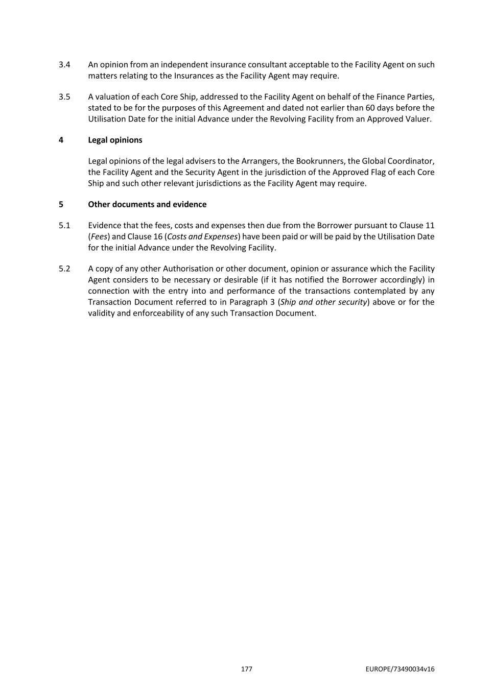 177 EUROPE/73490034v16 3.4 An opinion from an independent insurance consultant acceptable to the Facility Agent on such matters relating to the Insurances as the Facility Agent may require. 3.5 A valuation of each Core Ship, addressed to the Facility Agent on behalf of the Finance Parties, stated to be for the purposes of this Agreement and dated not earlier than 60 days before the Utilisation Date for the initial Advance under the Revolving Facility from an Approved Valuer. 4 Legal opinions Legal opinions of the legal advisers to the Arrangers, the Bookrunners, the Global Coordinator, the Facility Agent and the Security Agent in the jurisdiction of the Approved Flag of each Core Ship and such other relevant jurisdictions as the Facility Agent may require. 5 Other documents and evidence 5.1 Evidence that the fees, costs and expenses then due from the Borrower pursuant to Clause 11 (Fees) and Clause 16 (Costs and Expenses) have been paid or will be paid by the Utilisation Date for the initial Advance under the Revolving Facility. 5.2 A copy of any other Authorisation or other document, opinion or assurance which the Facility Agent considers to be necessary or desirable (if it has notified the Borrower accordingly) in connection with the entry into and performance of the transactions contemplated by any Transaction Document referred to in Paragraph 3 (Ship and other security) above or for the validity and enforceability of any such Transaction Document.