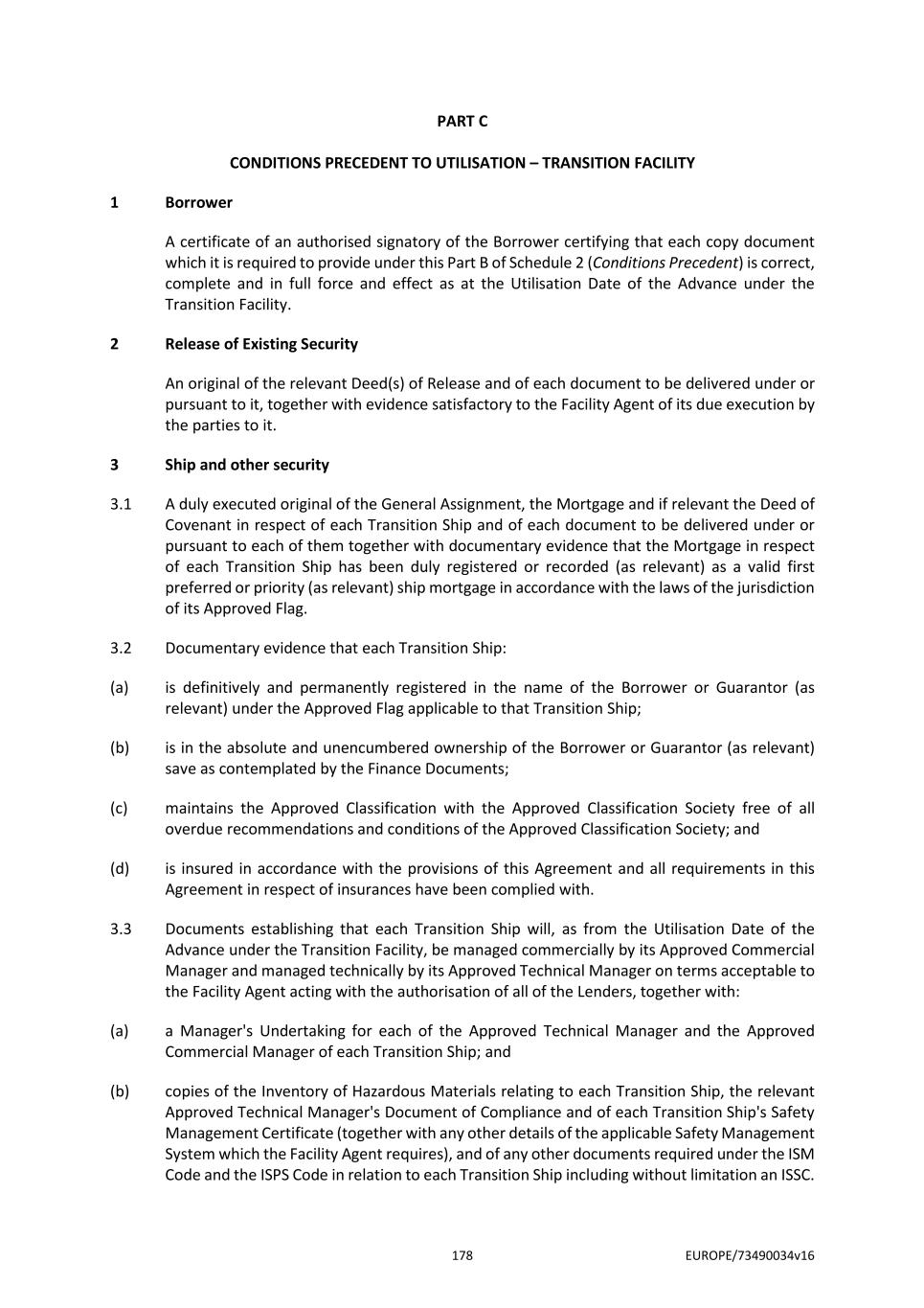 178 EUROPE/73490034v16 PART C CONDITIONS PRECEDENT TO UTILISATION – TRANSITION FACILITY 1 Borrower A certificate of an authorised signatory of the Borrower certifying that each copy document which it is required to provide under this Part B of Schedule 2 (Conditions Precedent) is correct, complete and in full force and effect as at the Utilisation Date of the Advance under the Transition Facility. 2 Release of Existing Security An original of the relevant Deed(s) of Release and of each document to be delivered under or pursuant to it, together with evidence satisfactory to the Facility Agent of its due execution by the parties to it. 3 Ship and other security 3.1 A duly executed original of the General Assignment, the Mortgage and if relevant the Deed of Covenant in respect of each Transition Ship and of each document to be delivered under or pursuant to each of them together with documentary evidence that the Mortgage in respect of each Transition Ship has been duly registered or recorded (as relevant) as a valid first preferred or priority (as relevant) ship mortgage in accordance with the laws of the jurisdiction of its Approved Flag. 3.2 Documentary evidence that each Transition Ship: (a) is definitively and permanently registered in the name of the Borrower or Guarantor (as relevant) under the Approved Flag applicable to that Transition Ship; (b) is in the absolute and unencumbered ownership of the Borrower or Guarantor (as relevant) save as contemplated by the Finance Documents; (c) maintains the Approved Classification with the Approved Classification Society free of all overdue recommendations and conditions of the Approved Classification Society; and (d) is insured in accordance with the provisions of this Agreement and all requirements in this Agreement in respect of insurances have been complied with. 3.3 Documents establishing that each Transition Ship will, as from the Utilisation Date of the Advance under the Transition Facility, be managed commercially by its Approved Commercial Manager and managed technically by its Approved Technical Manager on terms acceptable to the Facility Agent acting with the authorisation of all of the Lenders, together with: (a) a Manager's Undertaking for each of the Approved Technical Manager and the Approved Commercial Manager of each Transition Ship; and (b) copies of the Inventory of Hazardous Materials relating to each Transition Ship, the relevant Approved Technical Manager's Document of Compliance and of each Transition Ship's Safety Management Certificate (together with any other details of the applicable Safety Management System which the Facility Agent requires), and of any other documents required under the ISM Code and the ISPS Code in relation to each Transition Ship including without limitation an ISSC.