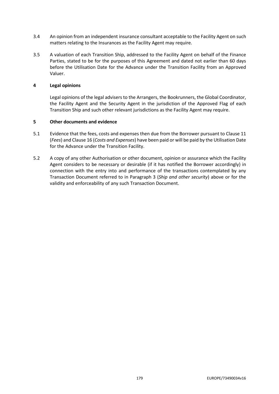 179 EUROPE/73490034v16 3.4 An opinion from an independent insurance consultant acceptable to the Facility Agent on such matters relating to the Insurances as the Facility Agent may require. 3.5 A valuation of each Transition Ship, addressed to the Facility Agent on behalf of the Finance Parties, stated to be for the purposes of this Agreement and dated not earlier than 60 days before the Utilisation Date for the Advance under the Transition Facility from an Approved Valuer. 4 Legal opinions Legal opinions of the legal advisers to the Arrangers, the Bookrunners, the Global Coordinator, the Facility Agent and the Security Agent in the jurisdiction of the Approved Flag of each Transition Ship and such other relevant jurisdictions as the Facility Agent may require. 5 Other documents and evidence 5.1 Evidence that the fees, costs and expenses then due from the Borrower pursuant to Clause 11 (Fees) and Clause 16 (Costs and Expenses) have been paid or will be paid by the Utilisation Date for the Advance under the Transition Facility. 5.2 A copy of any other Authorisation or other document, opinion or assurance which the Facility Agent considers to be necessary or desirable (if it has notified the Borrower accordingly) in connection with the entry into and performance of the transactions contemplated by any Transaction Document referred to in Paragraph 3 (Ship and other security) above or for the validity and enforceability of any such Transaction Document.
