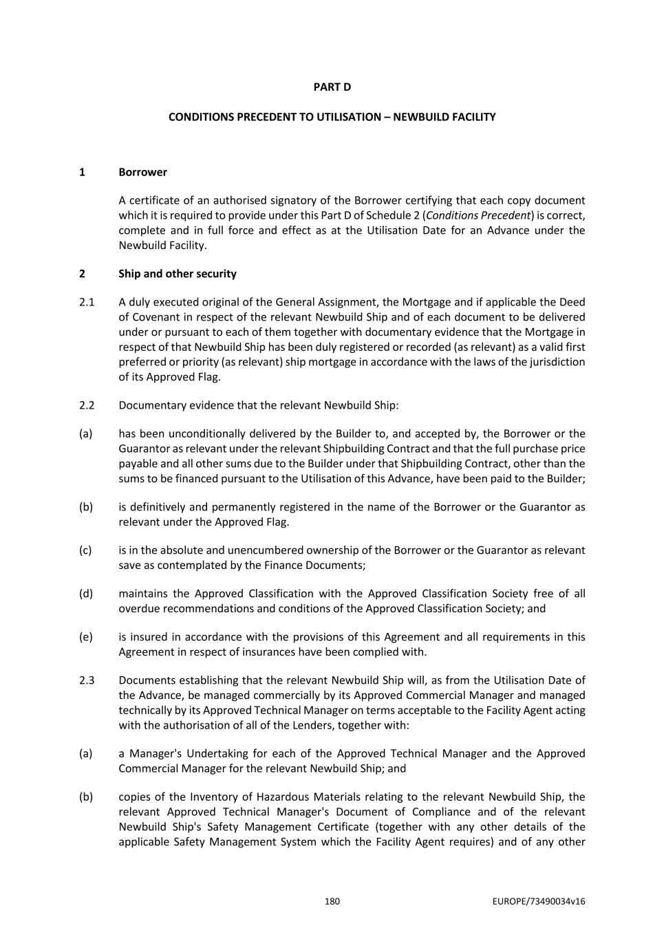 180 EUROPE/73490034v16 PART D CONDITIONS PRECEDENT TO UTILISATION – NEWBUILD FACILITY 1 Borrower A certificate of an authorised signatory of the Borrower certifying that each copy document which it is required to provide under this Part D of Schedule 2 (Conditions Precedent) is correct, complete and in full force and effect as at the Utilisation Date for an Advance under the Newbuild Facility. 2 Ship and other security 2.1 A duly executed original of the General Assignment, the Mortgage and if applicable the Deed of Covenant in respect of the relevant Newbuild Ship and of each document to be delivered under or pursuant to each of them together with documentary evidence that the Mortgage in respect of that Newbuild Ship has been duly registered or recorded (as relevant) as a valid first preferred or priority (as relevant) ship mortgage in accordance with the laws of the jurisdiction of its Approved Flag. 2.2 Documentary evidence that the relevant Newbuild Ship: (a) has been unconditionally delivered by the Builder to, and accepted by, the Borrower or the Guarantor as relevant under the relevant Shipbuilding Contract and that the full purchase price payable and all other sums due to the Builder under that Shipbuilding Contract, other than the sums to be financed pursuant to the Utilisation of this Advance, have been paid to the Builder; (b) is definitively and permanently registered in the name of the Borrower or the Guarantor as relevant under the Approved Flag. (c) is in the absolute and unencumbered ownership of the Borrower or the Guarantor as relevant save as contemplated by the Finance Documents; (d) maintains the Approved Classification with the Approved Classification Society free of all overdue recommendations and conditions of the Approved Classification Society; and (e) is insured in accordance with the provisions of this Agreement and all requirements in this Agreement in respect of insurances have been complied with. 2.3 Documents establishing that the relevant Newbuild Ship will, as from the Utilisation Date of the Advance, be managed commercially by its Approved Commercial Manager and managed technically by its Approved Technical Manager on terms acceptable to the Facility Agent acting with the authorisation of all of the Lenders, together with: (a) a Manager's Undertaking for each of the Approved Technical Manager and the Approved Commercial Manager for the relevant Newbuild Ship; and (b) copies of the Inventory of Hazardous Materials relating to the relevant Newbuild Ship, the relevant Approved Technical Manager's Document of Compliance and of the relevant Newbuild Ship's Safety Management Certificate (together with any other details of the applicable Safety Management System which the Facility Agent requires) and of any other