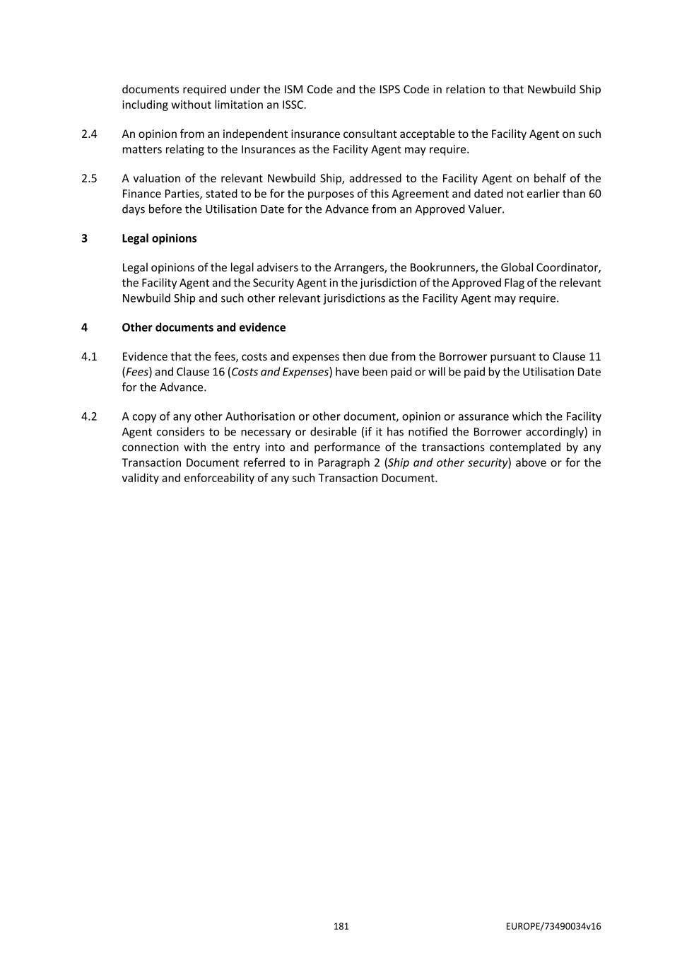 181 EUROPE/73490034v16 documents required under the ISM Code and the ISPS Code in relation to that Newbuild Ship including without limitation an ISSC. 2.4 An opinion from an independent insurance consultant acceptable to the Facility Agent on such matters relating to the Insurances as the Facility Agent may require. 2.5 A valuation of the relevant Newbuild Ship, addressed to the Facility Agent on behalf of the Finance Parties, stated to be for the purposes of this Agreement and dated not earlier than 60 days before the Utilisation Date for the Advance from an Approved Valuer. 3 Legal opinions Legal opinions of the legal advisers to the Arrangers, the Bookrunners, the Global Coordinator, the Facility Agent and the Security Agent in the jurisdiction of the Approved Flag of the relevant Newbuild Ship and such other relevant jurisdictions as the Facility Agent may require. 4 Other documents and evidence 4.1 Evidence that the fees, costs and expenses then due from the Borrower pursuant to Clause 11 (Fees) and Clause 16 (Costs and Expenses) have been paid or will be paid by the Utilisation Date for the Advance. 4.2 A copy of any other Authorisation or other document, opinion or assurance which the Facility Agent considers to be necessary or desirable (if it has notified the Borrower accordingly) in connection with the entry into and performance of the transactions contemplated by any Transaction Document referred to in Paragraph 2 (Ship and other security) above or for the validity and enforceability of any such Transaction Document.