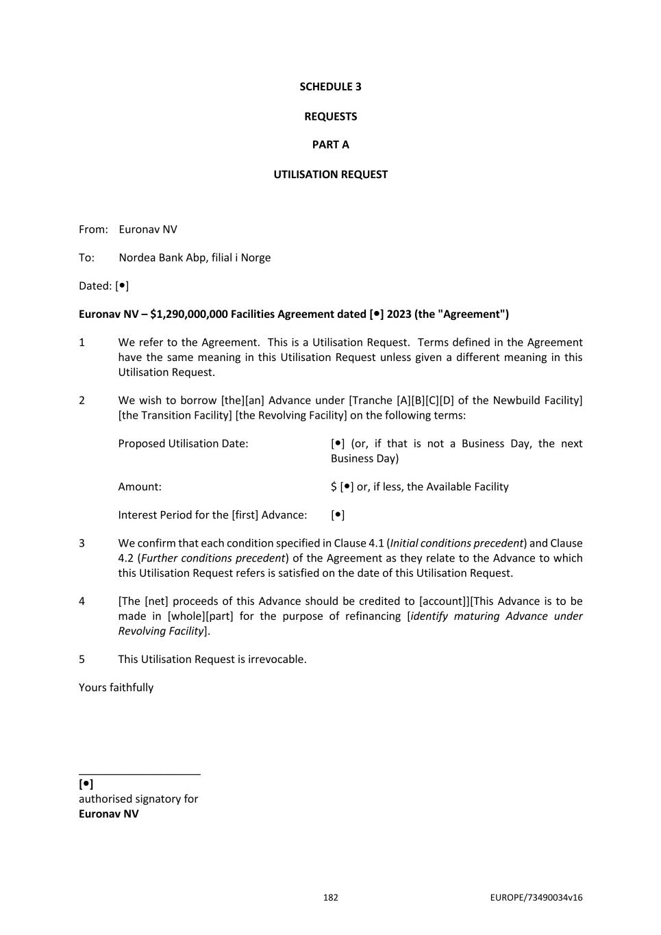 182 EUROPE/73490034v16 SCHEDULE 3 REQUESTS PART A UTILISATION REQUEST From: Euronav NV To: Nordea Bank Abp, filial i Norge Dated: [] Euronav NV – $1,290,000,000 Facilities Agreement dated [] 2023 (the "Agreement") 1 We refer to the Agreement. This is a Utilisation Request. Terms defined in the Agreement have the same meaning in this Utilisation Request unless given a different meaning in this Utilisation Request. 2 We wish to borrow [the][an] Advance under [Tranche [A][B][C][D] of the Newbuild Facility] [the Transition Facility] [the Revolving Facility] on the following terms: Proposed Utilisation Date: [] (or, if that is not a Business Day, the next Business Day) Amount: $ [] or, if less, the Available Facility Interest Period for the [first] Advance: [] 3 We confirm that each condition specified in Clause 4.1 (Initial conditions precedent) and Clause 4.2 (Further conditions precedent) of the Agreement as they relate to the Advance to which this Utilisation Request refers is satisfied on the date of this Utilisation Request. 4 [The [net] proceeds of this Advance should be credited to [account]][This Advance is to be made in [whole][part] for the purpose of refinancing [identify maturing Advance under Revolving Facility]. 5 This Utilisation Request is irrevocable. Yours faithfully ____________________ [] authorised signatory for Euronav NV