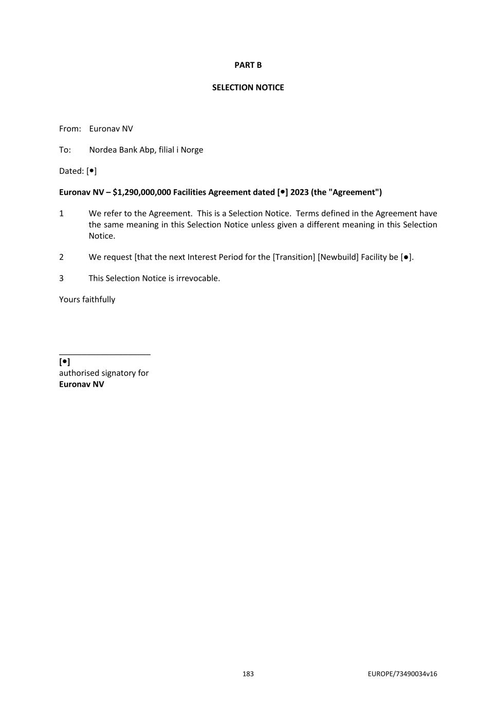 183 EUROPE/73490034v16 PART B SELECTION NOTICE From: Euronav NV To: Nordea Bank Abp, filial i Norge Dated: [] Euronav NV – $1,290,000,000 Facilities Agreement dated [] 2023 (the "Agreement") 1 We refer to the Agreement. This is a Selection Notice. Terms defined in the Agreement have the same meaning in this Selection Notice unless given a different meaning in this Selection Notice. 2 We request [that the next Interest Period for the [Transition] [Newbuild] Facility be [●]. 3 This Selection Notice is irrevocable. Yours faithfully ____________________ [] authorised signatory for Euronav NV
