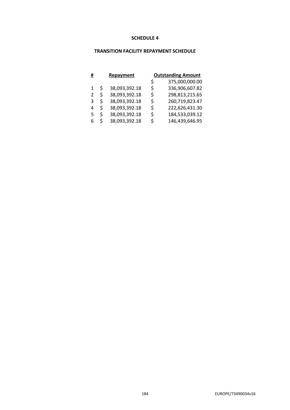 184 EUROPE/73490034v16 SCHEDULE 4 TRANSITION FACILITY REPAYMENT SCHEDULE # Repayment Outstanding Amount $ 375,000,000.00 1 $ 38,093,392.18 $ 336,906,607.82 2 $ 38,093,392.18 $ 298,813,215.65 3 $ 38,093,392.18 $ 260,719,823.47 4 $ 38,093,392.18 $ 222,626,431.30 5 $ 38,093,392.18 $ 184,533,039.12 6 $ 38,093,392.18 $ 146,439,646.95