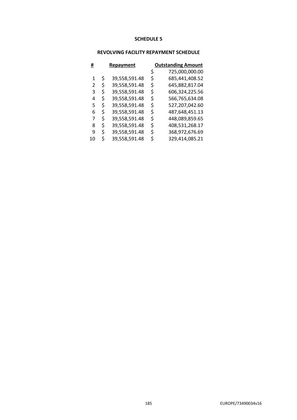 185 EUROPE/73490034v16 SCHEDULE 5 REVOLVING FACILITY REPAYMENT SCHEDULE # Repayment Outstanding Amount $ 725,000,000.00 1 $ 39,558,591.48 $ 685,441,408.52 2 $ 39,558,591.48 $ 645,882,817.04 3 $ 39,558,591.48 $ 606,324,225.56 4 $ 39,558,591.48 $ 566,765,634.08 5 $ 39,558,591.48 $ 527,207,042.60 6 $ 39,558,591.48 $ 487,648,451.13 7 $ 39,558,591.48 $ 448,089,859.65 8 $ 39,558,591.48 $ 408,531,268.17 9 $ 39,558,591.48 $ 368,972,676.69 10 $ 39,558,591.48 $ 329,414,085.21
