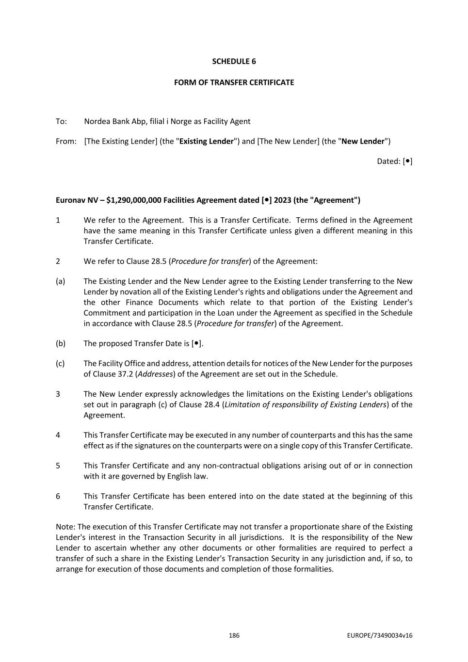 186 EUROPE/73490034v16 SCHEDULE 6 FORM OF TRANSFER CERTIFICATE To: Nordea Bank Abp, filial i Norge as Facility Agent From: [The Existing Lender] (the "Existing Lender") and [The New Lender] (the "New Lender") Dated: [] Euronav NV – $1,290,000,000 Facilities Agreement dated [] 2023 (the "Agreement") 1 We refer to the Agreement. This is a Transfer Certificate. Terms defined in the Agreement have the same meaning in this Transfer Certificate unless given a different meaning in this Transfer Certificate. 2 We refer to Clause 28.5 (Procedure for transfer) of the Agreement: (a) The Existing Lender and the New Lender agree to the Existing Lender transferring to the New Lender by novation all of the Existing Lender's rights and obligations under the Agreement and the other Finance Documents which relate to that portion of the Existing Lender's Commitment and participation in the Loan under the Agreement as specified in the Schedule in accordance with Clause 28.5 (Procedure for transfer) of the Agreement. (b) The proposed Transfer Date is []. (c) The Facility Office and address, attention details for notices of the New Lender for the purposes of Clause 37.2 (Addresses) of the Agreement are set out in the Schedule. 3 The New Lender expressly acknowledges the limitations on the Existing Lender's obligations set out in paragraph (c) of Clause 28.4 (Limitation of responsibility of Existing Lenders) of the Agreement. 4 This Transfer Certificate may be executed in any number of counterparts and this has the same effect as if the signatures on the counterparts were on a single copy of this Transfer Certificate. 5 This Transfer Certificate and any non-contractual obligations arising out of or in connection with it are governed by English law. 6 This Transfer Certificate has been entered into on the date stated at the beginning of this Transfer Certificate. Note: The execution of this Transfer Certificate may not transfer a proportionate share of the Existing Lender's interest in the Transaction Security in all jurisdictions. It is the responsibility of the New Lender to ascertain whether any other documents or other formalities are required to perfect a transfer of such a share in the Existing Lender's Transaction Security in any jurisdiction and, if so, to arrange for execution of those documents and completion of those formalities.