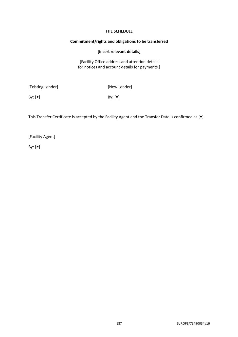 187 EUROPE/73490034v16 THE SCHEDULE Commitment/rights and obligations to be transferred [insert relevant details] [Facility Office address and attention details for notices and account details for payments.] [Existing Lender] [New Lender] By: [] By: [] This Transfer Certificate is accepted by the Facility Agent and the Transfer Date is confirmed as []. [Facility Agent] By: []