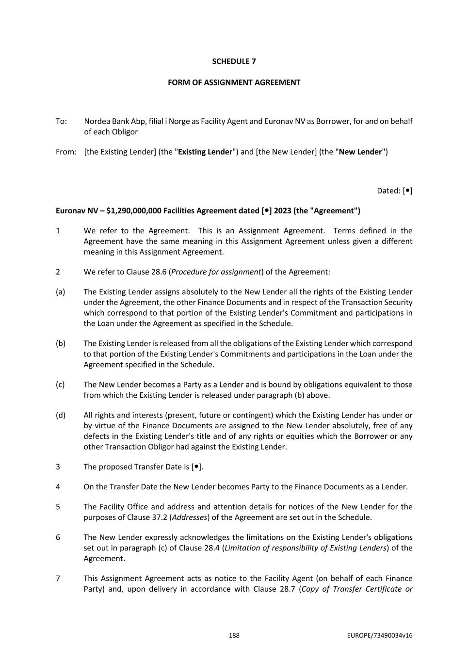 188 EUROPE/73490034v16 SCHEDULE 7 FORM OF ASSIGNMENT AGREEMENT To: Nordea Bank Abp, filial i Norge as Facility Agent and Euronav NV as Borrower, for and on behalf of each Obligor From: [the Existing Lender] (the "Existing Lender") and [the New Lender] (the "New Lender") Dated: [] Euronav NV – $1,290,000,000 Facilities Agreement dated [] 2023 (the "Agreement") 1 We refer to the Agreement. This is an Assignment Agreement. Terms defined in the Agreement have the same meaning in this Assignment Agreement unless given a different meaning in this Assignment Agreement. 2 We refer to Clause 28.6 (Procedure for assignment) of the Agreement: (a) The Existing Lender assigns absolutely to the New Lender all the rights of the Existing Lender under the Agreement, the other Finance Documents and in respect of the Transaction Security which correspond to that portion of the Existing Lender's Commitment and participations in the Loan under the Agreement as specified in the Schedule. (b) The Existing Lender is released from all the obligations of the Existing Lender which correspond to that portion of the Existing Lender's Commitments and participations in the Loan under the Agreement specified in the Schedule. (c) The New Lender becomes a Party as a Lender and is bound by obligations equivalent to those from which the Existing Lender is released under paragraph (b) above. (d) All rights and interests (present, future or contingent) which the Existing Lender has under or by virtue of the Finance Documents are assigned to the New Lender absolutely, free of any defects in the Existing Lender's title and of any rights or equities which the Borrower or any other Transaction Obligor had against the Existing Lender. 3 The proposed Transfer Date is []. 4 On the Transfer Date the New Lender becomes Party to the Finance Documents as a Lender. 5 The Facility Office and address and attention details for notices of the New Lender for the purposes of Clause 37.2 (Addresses) of the Agreement are set out in the Schedule. 6 The New Lender expressly acknowledges the limitations on the Existing Lender's obligations set out in paragraph (c) of Clause 28.4 (Limitation of responsibility of Existing Lenders) of the Agreement. 7 This Assignment Agreement acts as notice to the Facility Agent (on behalf of each Finance Party) and, upon delivery in accordance with Clause 28.7 (Copy of Transfer Certificate or