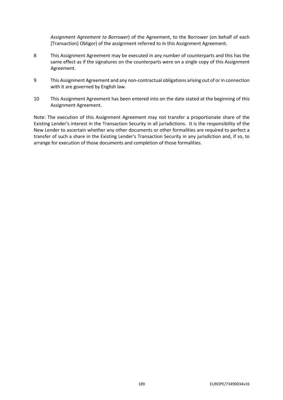 189 EUROPE/73490034v16 Assignment Agreement to Borrower) of the Agreement, to the Borrower (on behalf of each [Transaction] Obligor) of the assignment referred to in this Assignment Agreement. 8 This Assignment Agreement may be executed in any number of counterparts and this has the same effect as if the signatures on the counterparts were on a single copy of this Assignment Agreement. 9 This Assignment Agreement and any non-contractual obligations arising out of or in connection with it are governed by English law. 10 This Assignment Agreement has been entered into on the date stated at the beginning of this Assignment Agreement. Note: The execution of this Assignment Agreement may not transfer a proportionate share of the Existing Lender's interest in the Transaction Security in all jurisdictions. It is the responsibility of the New Lender to ascertain whether any other documents or other formalities are required to perfect a transfer of such a share in the Existing Lender's Transaction Security in any jurisdiction and, if so, to arrange for execution of those documents and completion of those formalities.