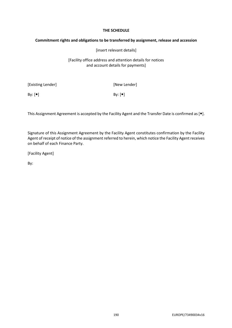 190 EUROPE/73490034v16 THE SCHEDULE Commitment rights and obligations to be transferred by assignment, release and accession [insert relevant details] [Facility office address and attention details for notices and account details for payments] [Existing Lender] [New Lender] By: [] By: [] This Assignment Agreement is accepted by the Facility Agent and the Transfer Date is confirmed as []. Signature of this Assignment Agreement by the Facility Agent constitutes confirmation by the Facility Agent of receipt of notice of the assignment referred to herein, which notice the Facility Agent receives on behalf of each Finance Party. [Facility Agent] By: