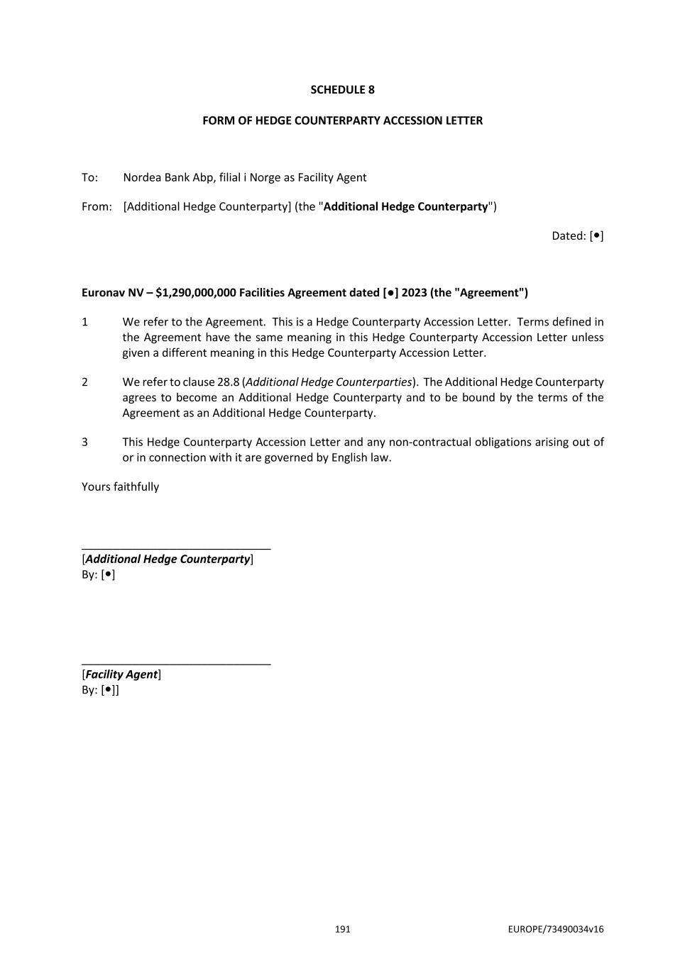 191 EUROPE/73490034v16 SCHEDULE 8 FORM OF HEDGE COUNTERPARTY ACCESSION LETTER To: Nordea Bank Abp, filial i Norge as Facility Agent From: [Additional Hedge Counterparty] (the "Additional Hedge Counterparty") Dated: [] Euronav NV – $1,290,000,000 Facilities Agreement dated [●] 2023 (the "Agreement") 1 We refer to the Agreement. This is a Hedge Counterparty Accession Letter. Terms defined in the Agreement have the same meaning in this Hedge Counterparty Accession Letter unless given a different meaning in this Hedge Counterparty Accession Letter. 2 We refer to clause 28.8 (Additional Hedge Counterparties). The Additional Hedge Counterparty agrees to become an Additional Hedge Counterparty and to be bound by the terms of the Agreement as an Additional Hedge Counterparty. 3 This Hedge Counterparty Accession Letter and any non-contractual obligations arising out of or in connection with it are governed by English law. Yours faithfully ______________________________ [Additional Hedge Counterparty] By: [] ______________________________ [Facility Agent] By: []]