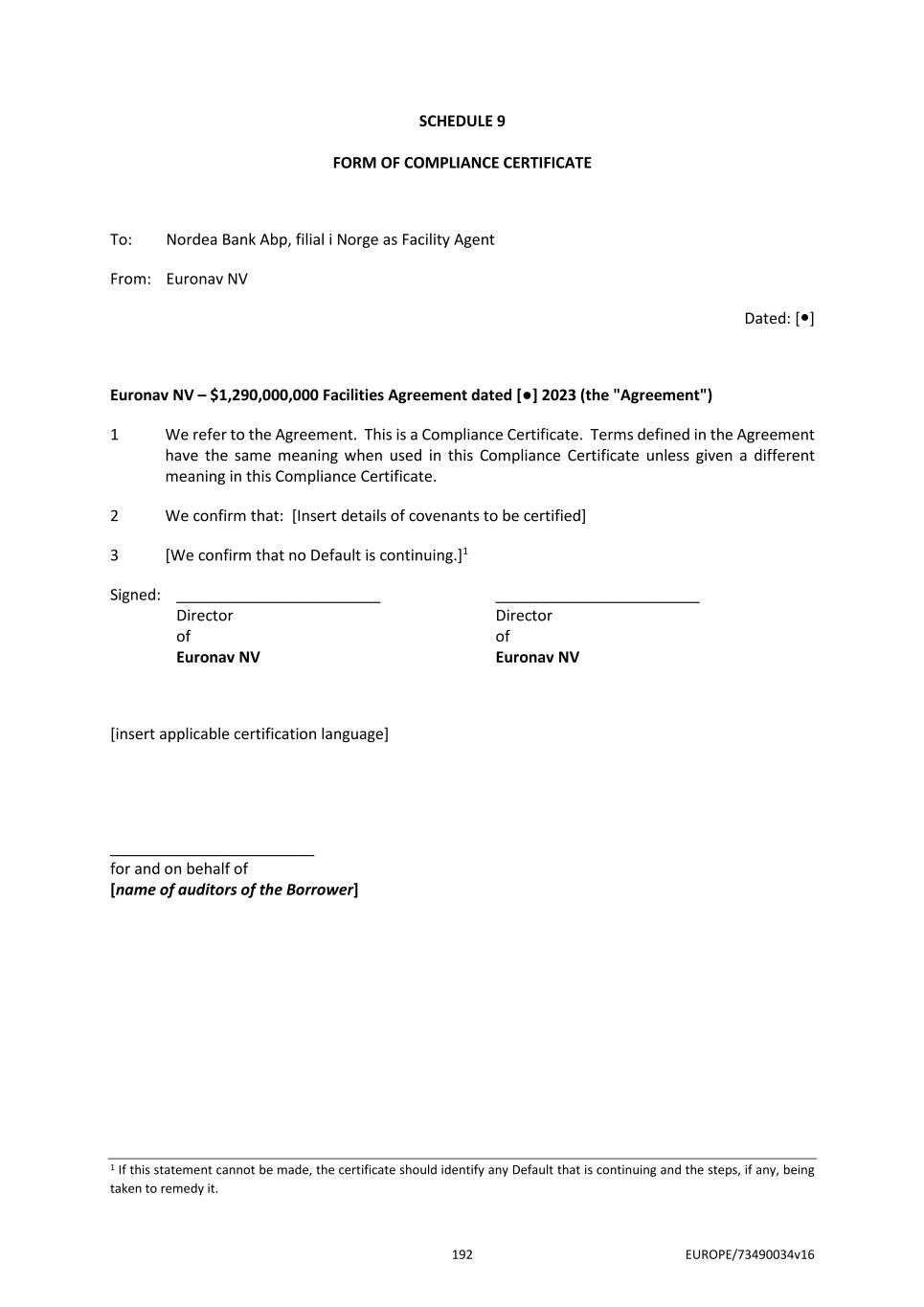 192 EUROPE/73490034v16 SCHEDULE 9 FORM OF COMPLIANCE CERTIFICATE To: Nordea Bank Abp, filial i Norge as Facility Agent From: Euronav NV Dated: [] Euronav NV – $1,290,000,000 Facilities Agreement dated [●] 2023 (the "Agreement") 1 We refer to the Agreement. This is a Compliance Certificate. Terms defined in the Agreement have the same meaning when used in this Compliance Certificate unless given a different meaning in this Compliance Certificate. 2 We confirm that: [Insert details of covenants to be certified] 3 [We confirm that no Default is continuing.]1 Signed: ________________________ ________________________ Director Director of of Euronav NV Euronav NV [insert applicable certification language] ________________________ for and on behalf of [name of auditors of the Borrower] 1 If this statement cannot be made, the certificate should identify any Default that is continuing and the steps, if any, being taken to remedy it.