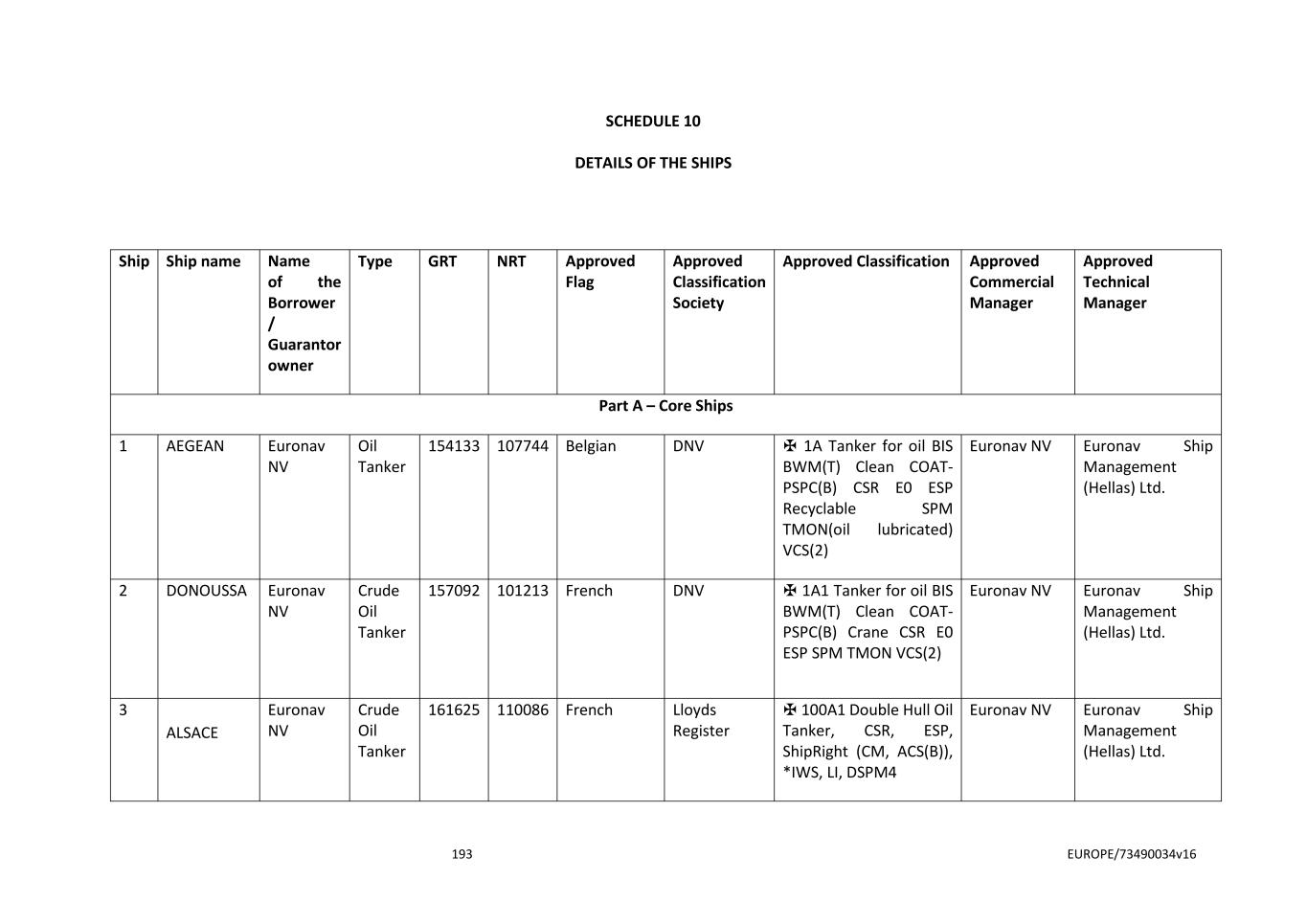 193 EUROPE/73490034v16 SCHEDULE 10 DETAILS OF THE SHIPS Ship Ship name Name of the Borrower / Guarantor owner Type GRT NRT Approved Flag Approved Classification Society Approved Classification Approved Commercial Manager Approved Technical Manager Part A – Core Ships 1 AEGEAN Euronav NV Oil Tanker 154133 107744 Belgian DNV ✠ 1A Tanker for oil BIS BWM(T) Clean COAT- PSPC(B) CSR E0 ESP Recyclable SPM TMON(oil lubricated) VCS(2) Euronav NV Euronav Ship Management (Hellas) Ltd. 2 DONOUSSA Euronav NV Crude Oil Tanker 157092 101213 French DNV ✠ 1A1 Tanker for oil BIS BWM(T) Clean COAT- PSPC(B) Crane CSR E0 ESP SPM TMON VCS(2) Euronav NV Euronav Ship Management (Hellas) Ltd. 3 ALSACE Euronav NV Crude Oil Tanker 161625 110086 French Lloyds Register ✠ 100A1 Double Hull Oil Tanker, CSR, ESP, ShipRight (CM, ACS(B)), *IWS, LI, DSPM4 Euronav NV Euronav Ship Management (Hellas) Ltd.