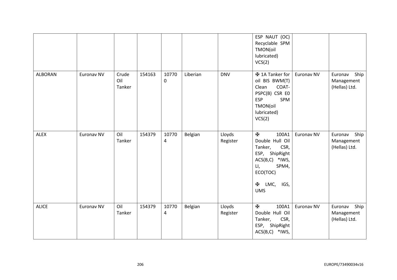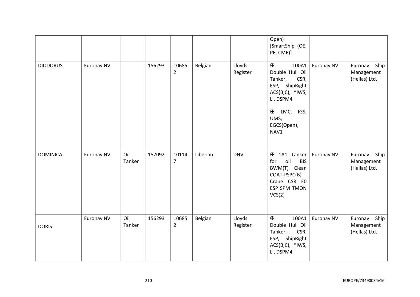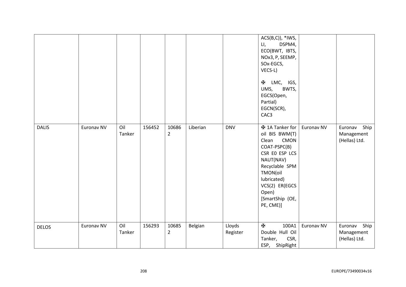 208 EUROPE/73490034v16 ACS(B,C)), *IWS, LI, DSPM4, ECO(BWT, IBTS, NOx3, P, SEEMP, SOx-EGCS, VECS-L) ✠ LMC, IGS, UMS, BWTS, EGCS(Open, Partial) EGCN(SCR), CAC3 DALIS Euronav NV Oil Tanker 156452 10686 2 Liberian DNV ✠ 1A Tanker for oil BIS BWM(T) Clean CMON COAT-PSPC(B) CSR E0 ESP LCS NAUT(NAV) Recyclable SPM TMON(oil lubricated) VCS(2) ER(EGCS Open) [SmartShip (OE, PE, CME)] Euronav NV Euronav Ship Management (Hellas) Ltd. DELOS Euronav NV Oil Tanker 156293 10685 2 Belgian Lloyds Register ✠ 100A1 Double Hull Oil Tanker, CSR, ESP, ShipRight Euronav NV Euronav Ship Management (Hellas) Ltd.