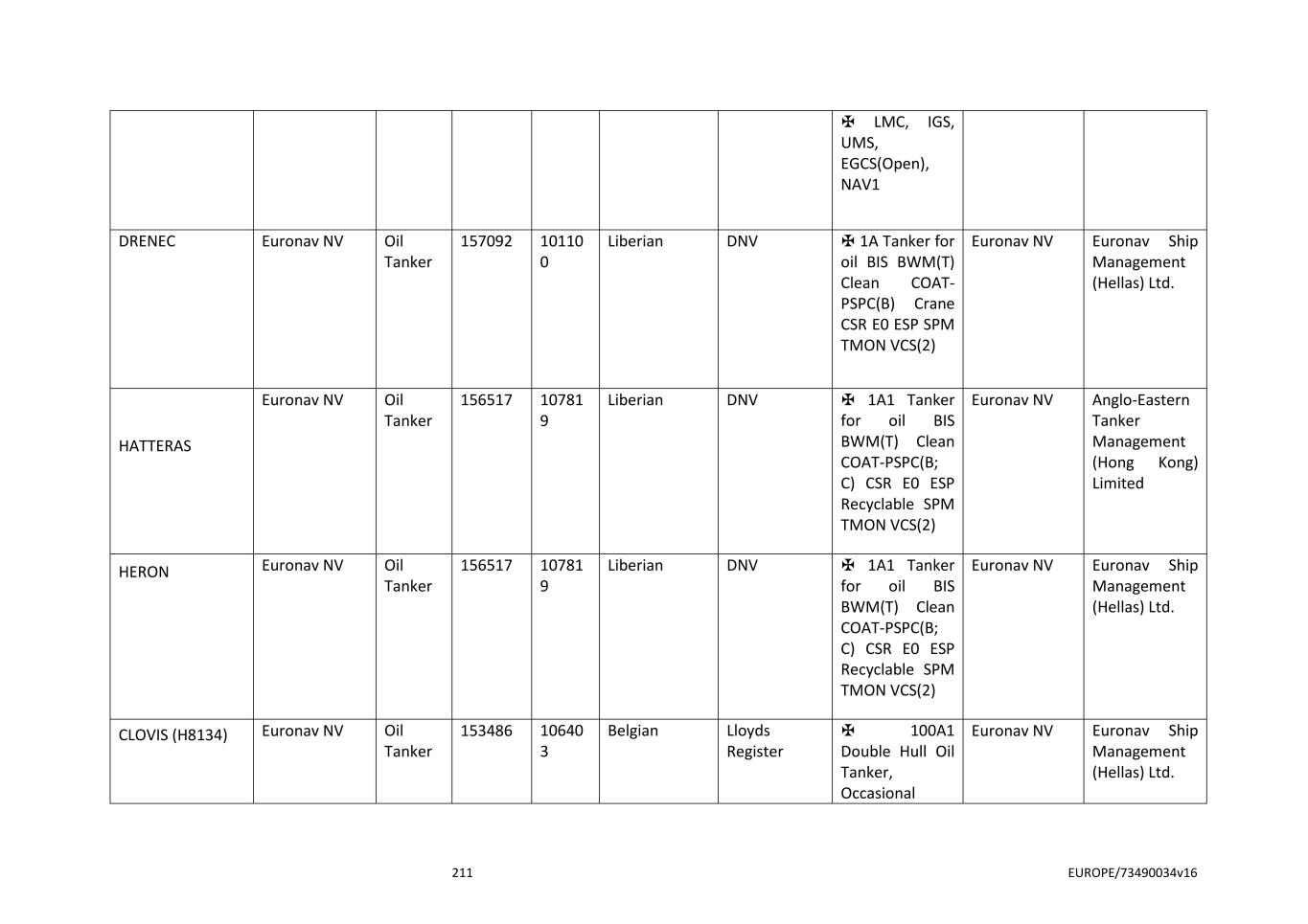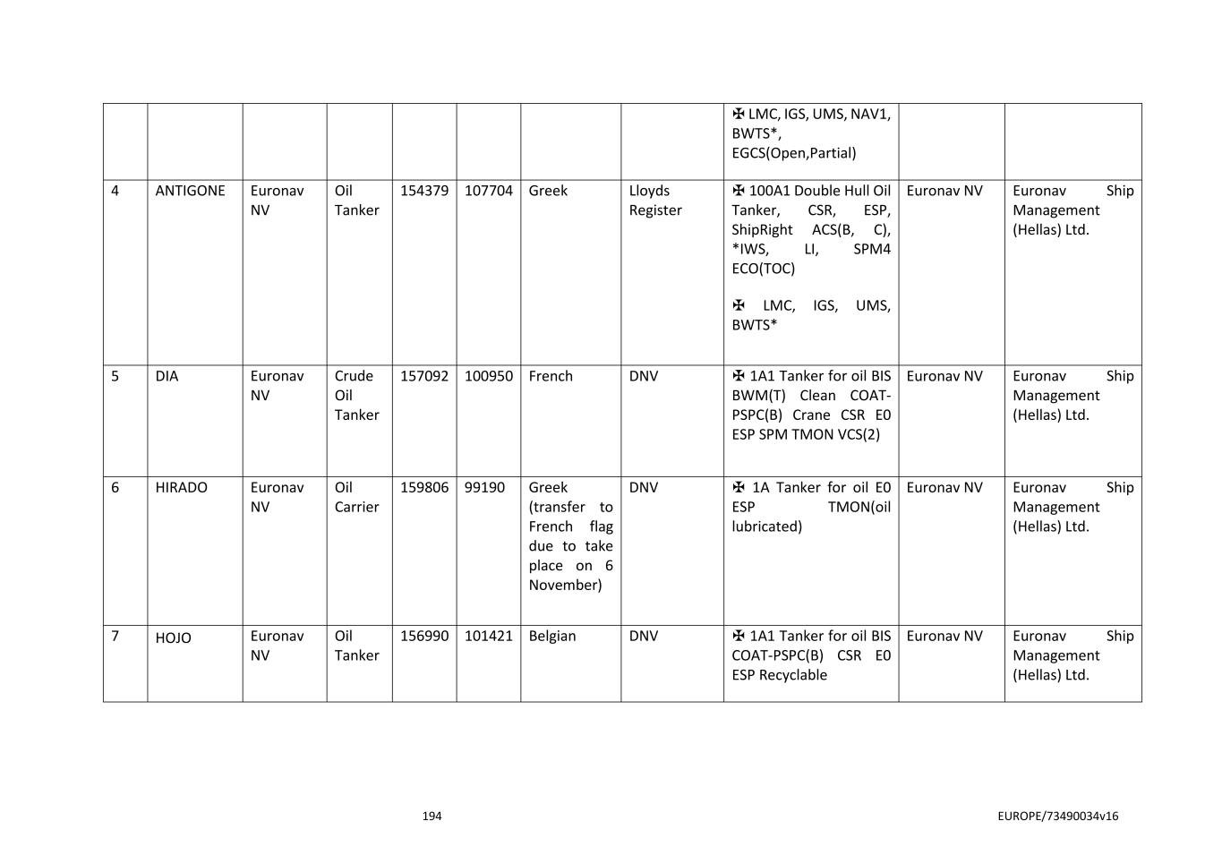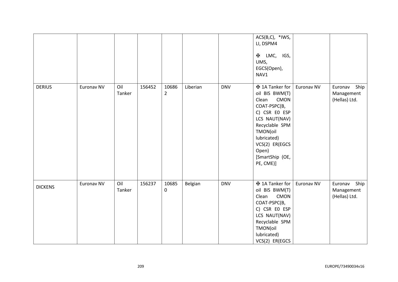 208 EUROPE/73490034v16 ACS(B,C)), *IWS, LI, DSPM4, ECO(BWT, IBTS, NOx3, P, SEEMP, SOx-EGCS, VECS-L) ✠ LMC, IGS, UMS, BWTS, EGCS(Open, Partial) EGCN(SCR), CAC3 DALIS Euronav NV Oil Tanker 156452 10686 2 Liberian DNV ✠ 1A Tanker for oil BIS BWM(T) Clean CMON COAT-PSPC(B) CSR E0 ESP LCS NAUT(NAV) Recyclable SPM TMON(oil lubricated) VCS(2) ER(EGCS Open) [SmartShip (OE, PE, CME)] Euronav NV Euronav Ship Management (Hellas) Ltd. DELOS Euronav NV Oil Tanker 156293 10685 2 Belgian Lloyds Register ✠ 100A1 Double Hull Oil Tanker, CSR, ESP, ShipRight Euronav NV Euronav Ship Management (Hellas) Ltd.