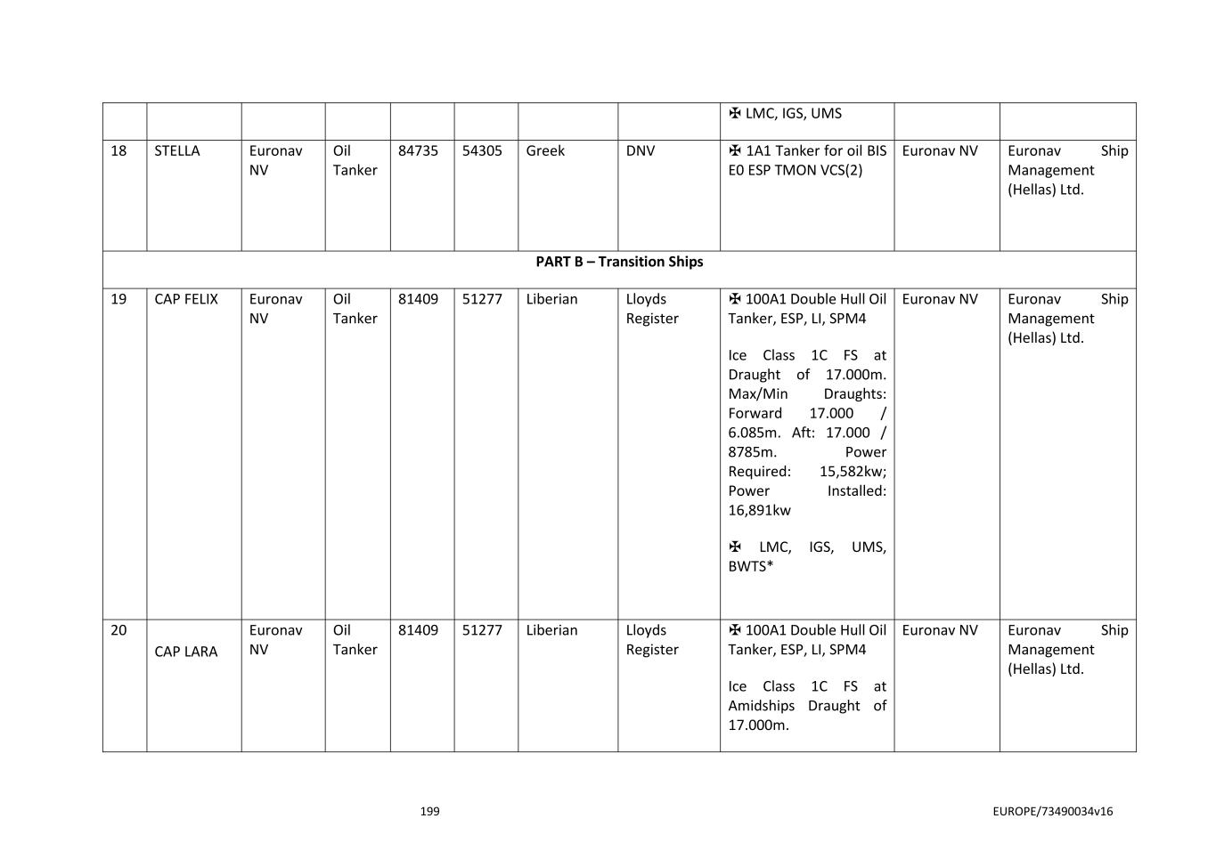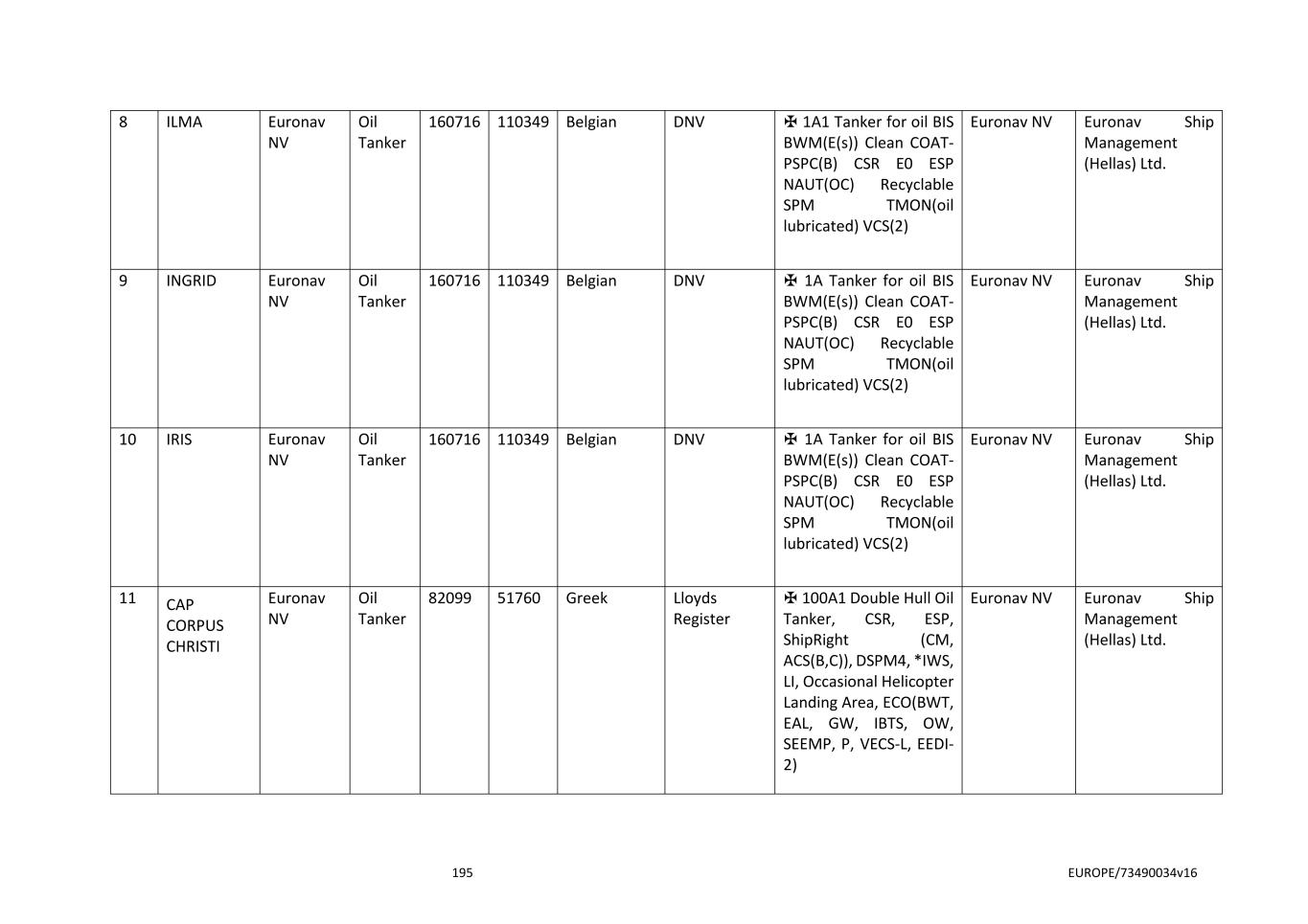 195 EUROPE/73490034v16 8 ILMA Euronav NV Oil Tanker 160716 110349 Belgian DNV ✠ 1A1 Tanker for oil BIS BWM(E(s)) Clean COAT- PSPC(B) CSR E0 ESP NAUT(OC) Recyclable SPM TMON(oil lubricated) VCS(2) Euronav NV Euronav Ship Management (Hellas) Ltd. 9 INGRID Euronav NV Oil Tanker 160716 110349 Belgian DNV ✠ 1A Tanker for oil BIS BWM(E(s)) Clean COAT- PSPC(B) CSR E0 ESP NAUT(OC) Recyclable SPM TMON(oil lubricated) VCS(2) Euronav NV Euronav Ship Management (Hellas) Ltd. 10 IRIS Euronav NV Oil Tanker 160716 110349 Belgian DNV ✠ 1A Tanker for oil BIS BWM(E(s)) Clean COAT- PSPC(B) CSR E0 ESP NAUT(OC) Recyclable SPM TMON(oil lubricated) VCS(2) Euronav NV Euronav Ship Management (Hellas) Ltd. 11 CAP CORPUS CHRISTI Euronav NV Oil Tanker 82099 51760 Greek Lloyds Register ✠ 100A1 Double Hull Oil Tanker, CSR, ESP, ShipRight (CM, ACS(B,C)), DSPM4, *IWS, LI, Occasional Helicopter Landing Area, ECO(BWT, EAL, GW, IBTS, OW, SEEMP, P, VECS-L, EEDI- 2) Euronav NV Euronav Ship Management (Hellas) Ltd.
