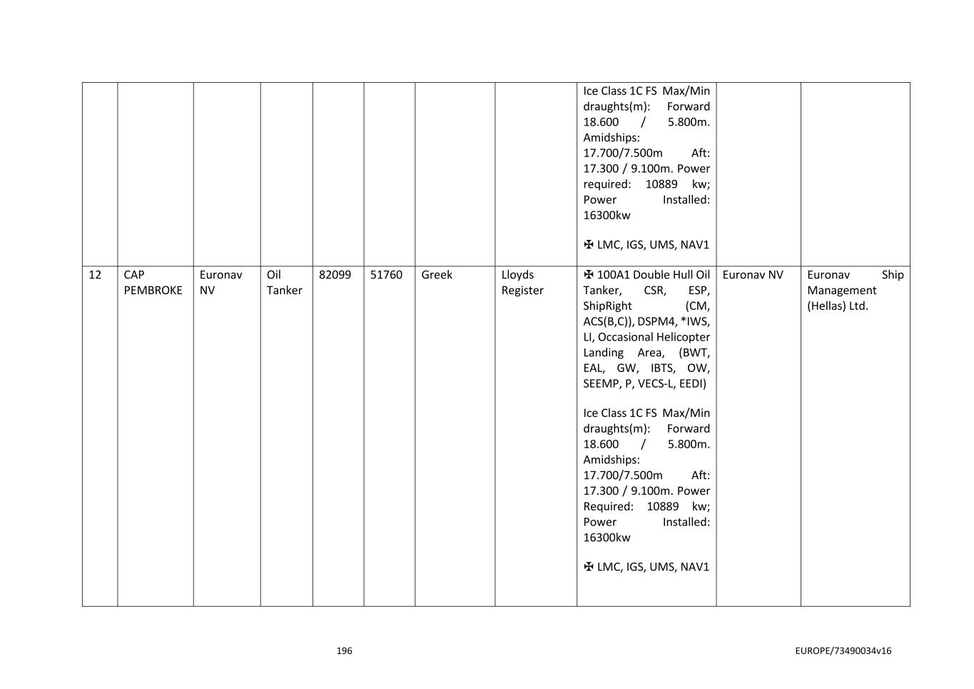196 EUROPE/73490034v16 Ice Class 1C FS Max/Min draughts(m): Forward 18.600 / 5.800m. Amidships: 17.700/7.500m Aft: 17.300 / 9.100m. Power required: 10889 kw; Power Installed: 16300kw ✠ LMC, IGS, UMS, NAV1 12 CAP PEMBROKE Euronav NV Oil Tanker 82099 51760 Greek Lloyds Register ✠ 100A1 Double Hull Oil Tanker, CSR, ESP, ShipRight (CM, ACS(B,C)), DSPM4, *IWS, LI, Occasional Helicopter Landing Area, (BWT, EAL, GW, IBTS, OW, SEEMP, P, VECS-L, EEDI) Ice Class 1C FS Max/Min draughts(m): Forward 18.600 / 5.800m. Amidships: 17.700/7.500m Aft: 17.300 / 9.100m. Power Required: 10889 kw; Power Installed: 16300kw ✠ LMC, IGS, UMS, NAV1 Euronav NV Euronav Ship Management (Hellas) Ltd.