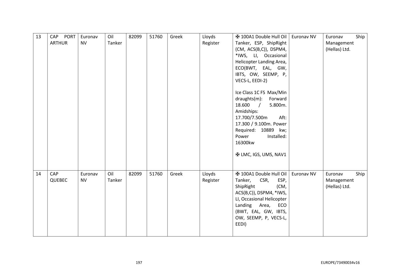 197 EUROPE/73490034v16 13 CAP PORT ARTHUR Euronav NV Oil Tanker 82099 51760 Greek Lloyds Register ✠ 100A1 Double Hull Oil Tanker, ESP, ShipRight (CM, ACS(B,C)), DSPM4, *IWS, LI, Occasional Helicopter Landing Area, ECO(BWT, EAL, GW, IBTS, OW, SEEMP, P, VECS-L, EEDI-2) Ice Class 1C FS Max/Min draughts(m): Forward 18.600 / 5.800m. Amidships: 17.700/7.500m Aft: 17.300 / 9.100m. Power Required: 10889 kw; Power Installed: 16300kw ✠ LMC, IGS, UMS, NAV1 Euronav NV Euronav Ship Management (Hellas) Ltd. 14 CAP QUEBEC Euronav NV Oil Tanker 82099 51760 Greek Lloyds Register ✠ 100A1 Double Hull Oil Tanker, CSR, ESP, ShipRight (CM, ACS(B,C)), DSPM4, *IWS, LI, Occasional Helicopter Landing Area, ECO (BWT, EAL, GW, IBTS, OW, SEEMP, P, VECS-L, EEDI) Euronav NV Euronav Ship Management (Hellas) Ltd.