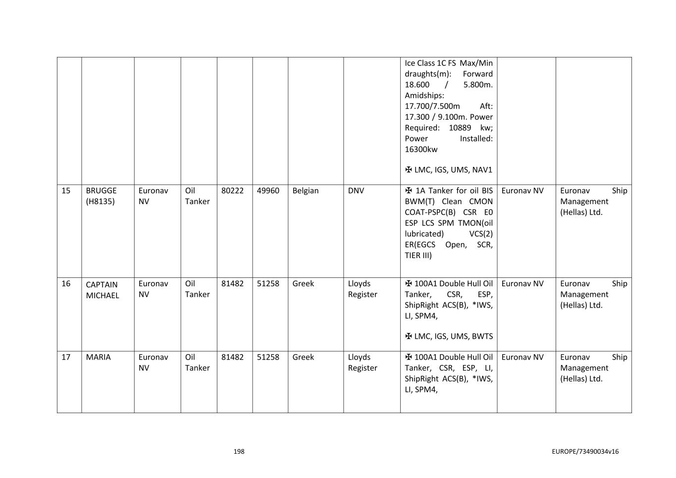 198 EUROPE/73490034v16 Ice Class 1C FS Max/Min draughts(m): Forward 18.600 / 5.800m. Amidships: 17.700/7.500m Aft: 17.300 / 9.100m. Power Required: 10889 kw; Power Installed: 16300kw ✠ LMC, IGS, UMS, NAV1 15 BRUGGE (H8135) Euronav NV Oil Tanker 80222 49960 Belgian DNV ✠ 1A Tanker for oil BIS BWM(T) Clean CMON COAT-PSPC(B) CSR E0 ESP LCS SPM TMON(oil lubricated) VCS(2) ER(EGCS Open, SCR, TIER III) Euronav NV Euronav Ship Management (Hellas) Ltd. 16 CAPTAIN MICHAEL Euronav NV Oil Tanker 81482 51258 Greek Lloyds Register ✠ 100A1 Double Hull Oil Tanker, CSR, ESP, ShipRight ACS(B), *IWS, LI, SPM4, ✠ LMC, IGS, UMS, BWTS Euronav NV Euronav Ship Management (Hellas) Ltd. 17 MARIA Euronav NV Oil Tanker 81482 51258 Greek Lloyds Register ✠ 100A1 Double Hull Oil Tanker, CSR, ESP, LI, ShipRight ACS(B), *IWS, LI, SPM4, Euronav NV Euronav Ship Management (Hellas) Ltd.