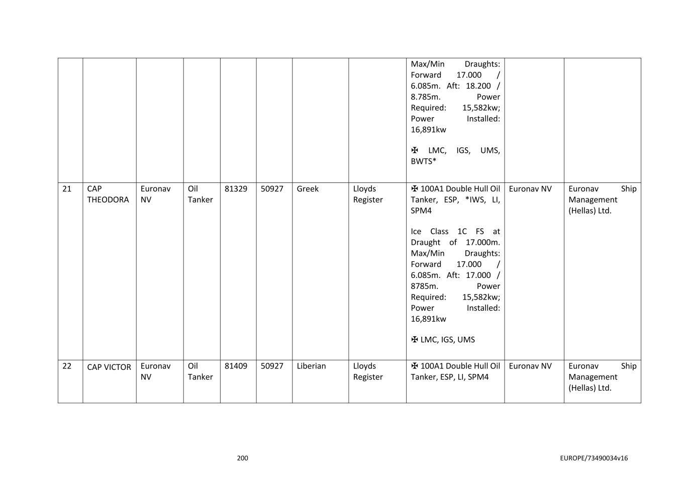 200 EUROPE/73490034v16 Max/Min Draughts: Forward 17.000 / 6.085m. Aft: 18.200 / 8.785m. Power Required: 15,582kw; Power Installed: 16,891kw ✠ LMC, IGS, UMS, BWTS* 21 CAP THEODORA Euronav NV Oil Tanker 81329 50927 Greek Lloyds Register ✠ 100A1 Double Hull Oil Tanker, ESP, *IWS, LI, SPM4 Ice Class 1C FS at Draught of 17.000m. Max/Min Draughts: Forward 17.000 / 6.085m. Aft: 17.000 / 8785m. Power Required: 15,582kw; Power Installed: 16,891kw ✠ LMC, IGS, UMS Euronav NV Euronav Ship Management (Hellas) Ltd. 22 CAP VICTOR Euronav NV Oil Tanker 81409 50927 Liberian Lloyds Register ✠ 100A1 Double Hull Oil Tanker, ESP, LI, SPM4 Euronav NV Euronav Ship Management (Hellas) Ltd.