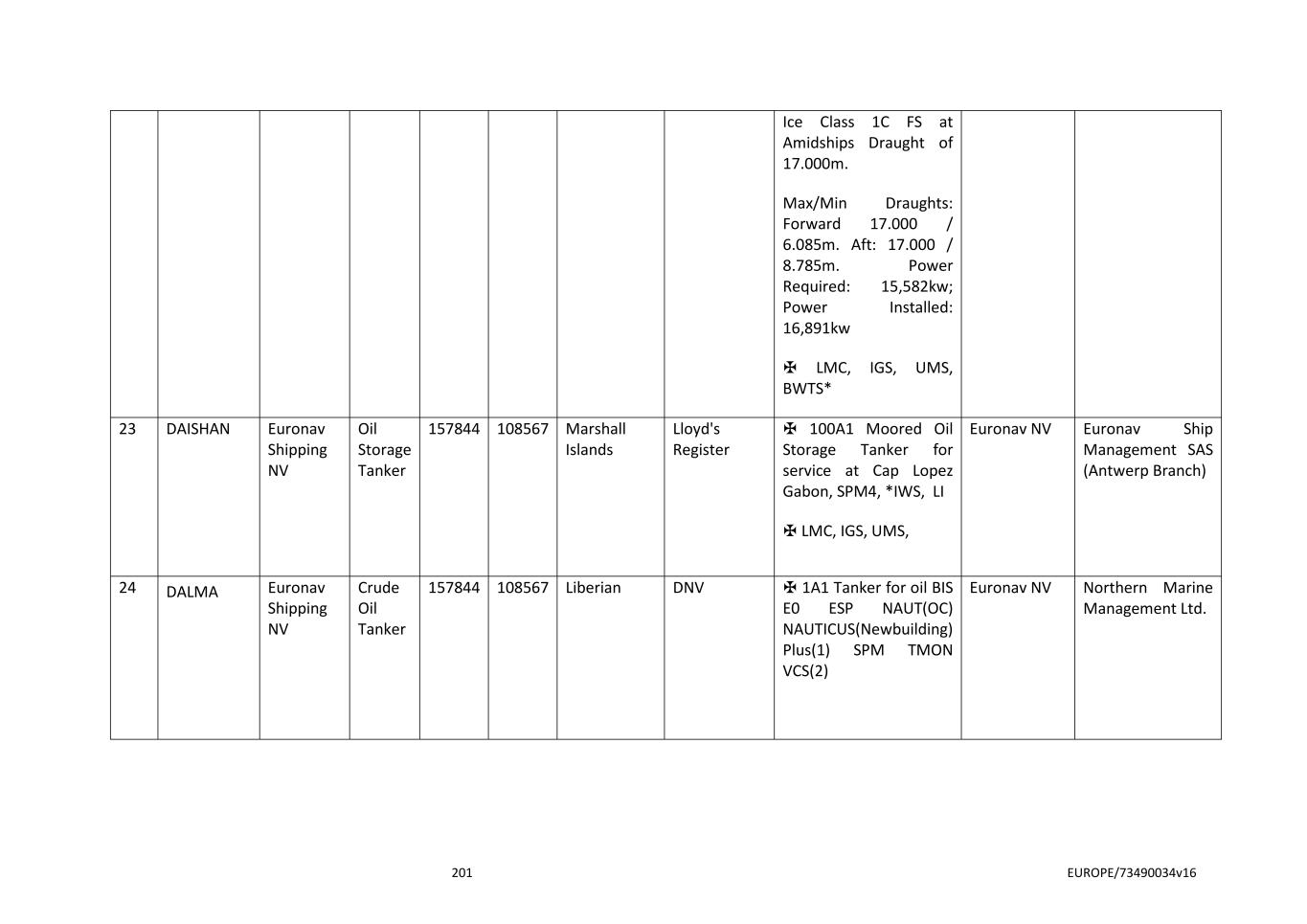 201 EUROPE/73490034v16 Ice Class 1C FS at Amidships Draught of 17.000m. Max/Min Draughts: Forward 17.000 / 6.085m. Aft: 17.000 / 8.785m. Power Required: 15,582kw; Power Installed: 16,891kw ✠ LMC, IGS, UMS, BWTS* 23 DAISHAN Euronav Shipping NV Oil Storage Tanker 157844 108567 Marshall Islands Lloyd's Register ✠ 100A1 Moored Oil Storage Tanker for service at Cap Lopez Gabon, SPM4, *IWS, LI ✠ LMC, IGS, UMS, Euronav NV Euronav Ship Management SAS (Antwerp Branch) 24 DALMA Euronav Shipping NV Crude Oil Tanker 157844 108567 Liberian DNV ✠ 1A1 Tanker for oil BIS E0 ESP NAUT(OC) NAUTICUS(Newbuilding) Plus(1) SPM TMON VCS(2) Euronav NV Northern Marine Management Ltd.