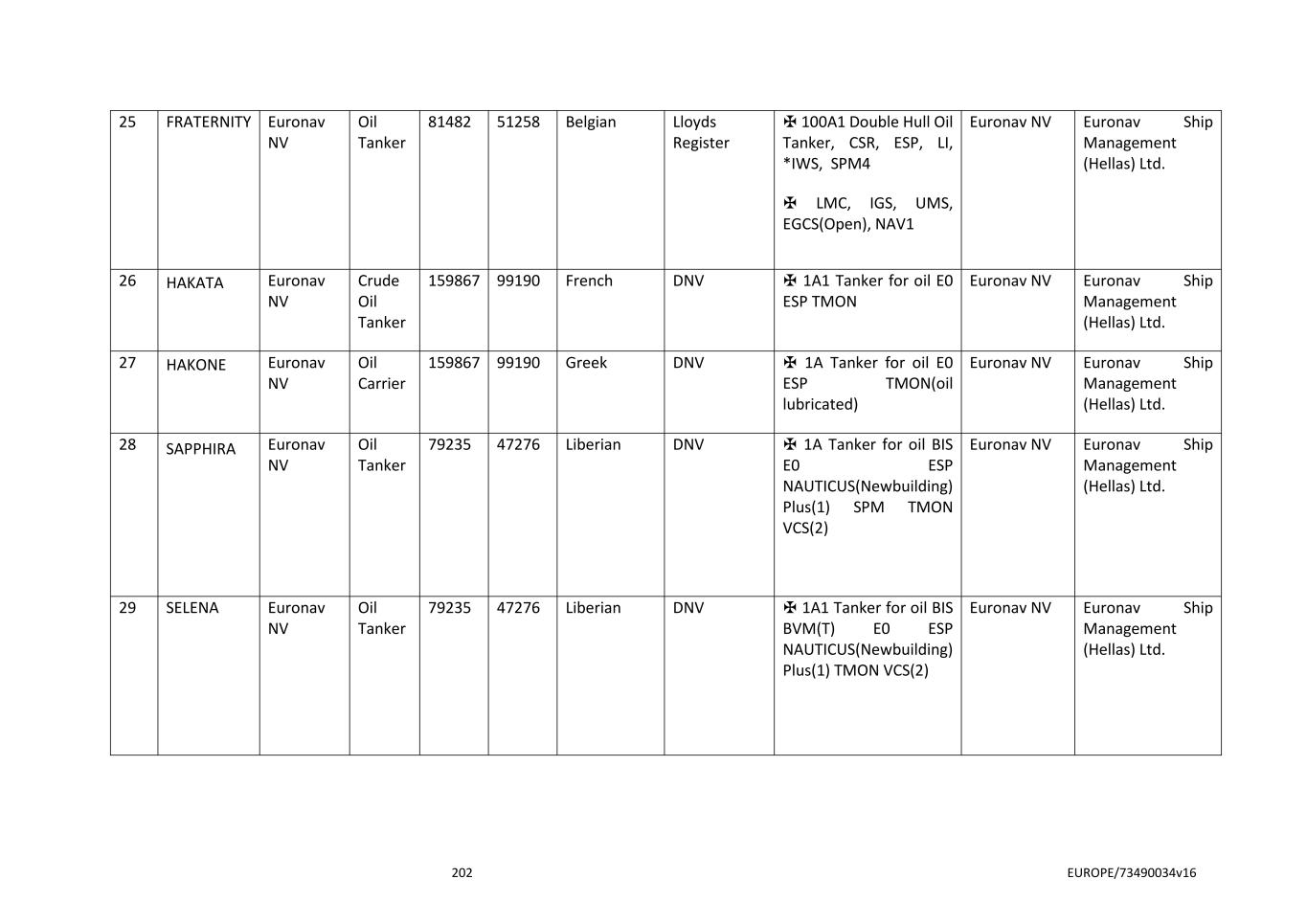 202 EUROPE/73490034v16 25 FRATERNITY Euronav NV Oil Tanker 81482 51258 Belgian Lloyds Register ✠ 100A1 Double Hull Oil Tanker, CSR, ESP, LI, *IWS, SPM4 ✠ LMC, IGS, UMS, EGCS(Open), NAV1 Euronav NV Euronav Ship Management (Hellas) Ltd. 26 HAKATA Euronav NV Crude Oil Tanker 159867 99190 French DNV ✠ 1A1 Tanker for oil E0 ESP TMON Euronav NV Euronav Ship Management (Hellas) Ltd. 27 HAKONE Euronav NV Oil Carrier 159867 99190 Greek DNV ✠ 1A Tanker for oil E0 ESP TMON(oil lubricated) Euronav NV Euronav Ship Management (Hellas) Ltd. 28 SAPPHIRA Euronav NV Oil Tanker 79235 47276 Liberian DNV ✠ 1A Tanker for oil BIS E0 ESP NAUTICUS(Newbuilding) Plus(1) SPM TMON VCS(2) Euronav NV Euronav Ship Management (Hellas) Ltd. 29 SELENA Euronav NV Oil Tanker 79235 47276 Liberian DNV ✠ 1A1 Tanker for oil BIS BVM(T) E0 ESP NAUTICUS(Newbuilding) Plus(1) TMON VCS(2) Euronav NV Euronav Ship Management (Hellas) Ltd.