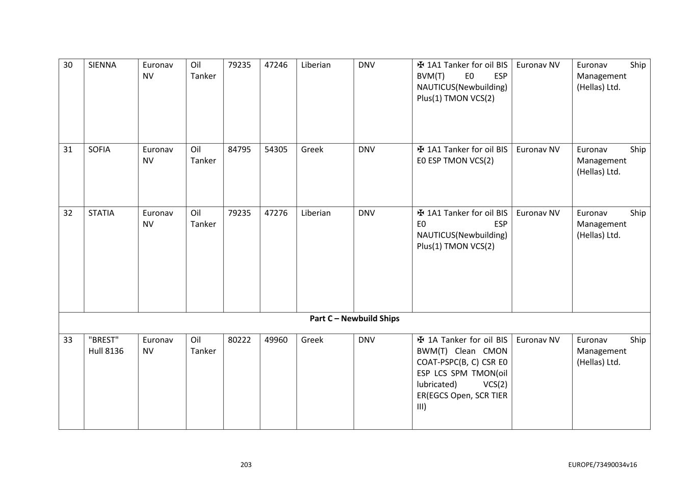 203 EUROPE/73490034v16 30 SIENNA Euronav NV Oil Tanker 79235 47246 Liberian DNV ✠ 1A1 Tanker for oil BIS BVM(T) E0 ESP NAUTICUS(Newbuilding) Plus(1) TMON VCS(2) Euronav NV Euronav Ship Management (Hellas) Ltd. 31 SOFIA Euronav NV Oil Tanker 84795 54305 Greek DNV ✠ 1A1 Tanker for oil BIS E0 ESP TMON VCS(2) Euronav NV Euronav Ship Management (Hellas) Ltd. 32 STATIA Euronav NV Oil Tanker 79235 47276 Liberian DNV ✠ 1A1 Tanker for oil BIS E0 ESP NAUTICUS(Newbuilding) Plus(1) TMON VCS(2) Euronav NV Euronav Ship Management (Hellas) Ltd. Part C – Newbuild Ships 33 "BREST" Hull 8136 Euronav NV Oil Tanker 80222 49960 Greek DNV ✠ 1A Tanker for oil BIS BWM(T) Clean CMON COAT-PSPC(B, C) CSR E0 ESP LCS SPM TMON(oil lubricated) VCS(2) ER(EGCS Open, SCR TIER III) Euronav NV Euronav Ship Management (Hellas) Ltd.