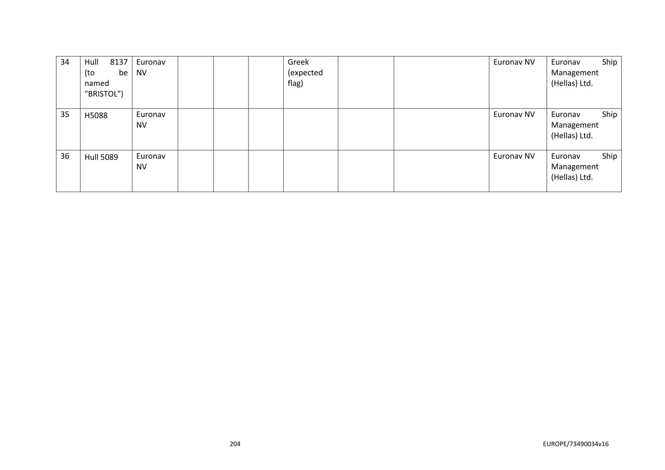 204 EUROPE/73490034v16 34 Hull 8137 (to be named "BRISTOL") Euronav NV Greek (expected flag) Euronav NV Euronav Ship Management (Hellas) Ltd. 35 H5088 Euronav NV Euronav NV Euronav Ship Management (Hellas) Ltd. 36 Hull 5089 Euronav NV Euronav NV Euronav Ship Management (Hellas) Ltd.