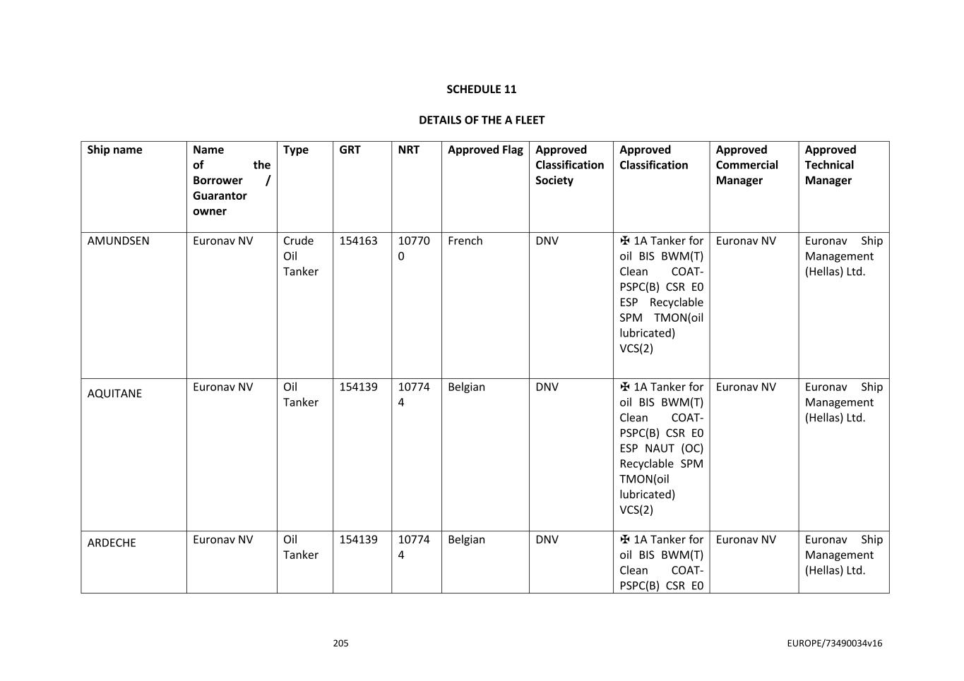 205 EUROPE/73490034v16 SCHEDULE 11 DETAILS OF THE A FLEET Ship name Name of the Borrower / Guarantor owner Type GRT NRT Approved Flag Approved Classification Society Approved Classification Approved Commercial Manager Approved Technical Manager AMUNDSEN Euronav NV Crude Oil Tanker 154163 10770 0 French DNV ✠ 1A Tanker for oil BIS BWM(T) Clean COAT- PSPC(B) CSR E0 ESP Recyclable SPM TMON(oil lubricated) VCS(2) Euronav NV Euronav Ship Management (Hellas) Ltd. AQUITANE Euronav NV Oil Tanker 154139 10774 4 Belgian DNV ✠ 1A Tanker for oil BIS BWM(T) Clean COAT- PSPC(B) CSR E0 ESP NAUT (OC) Recyclable SPM TMON(oil lubricated) VCS(2) Euronav NV Euronav Ship Management (Hellas) Ltd. ARDECHE Euronav NV Oil Tanker 154139 10774 4 Belgian DNV ✠ 1A Tanker for oil BIS BWM(T) Clean COAT- PSPC(B) CSR E0 Euronav NV Euronav Ship Management (Hellas) Ltd.