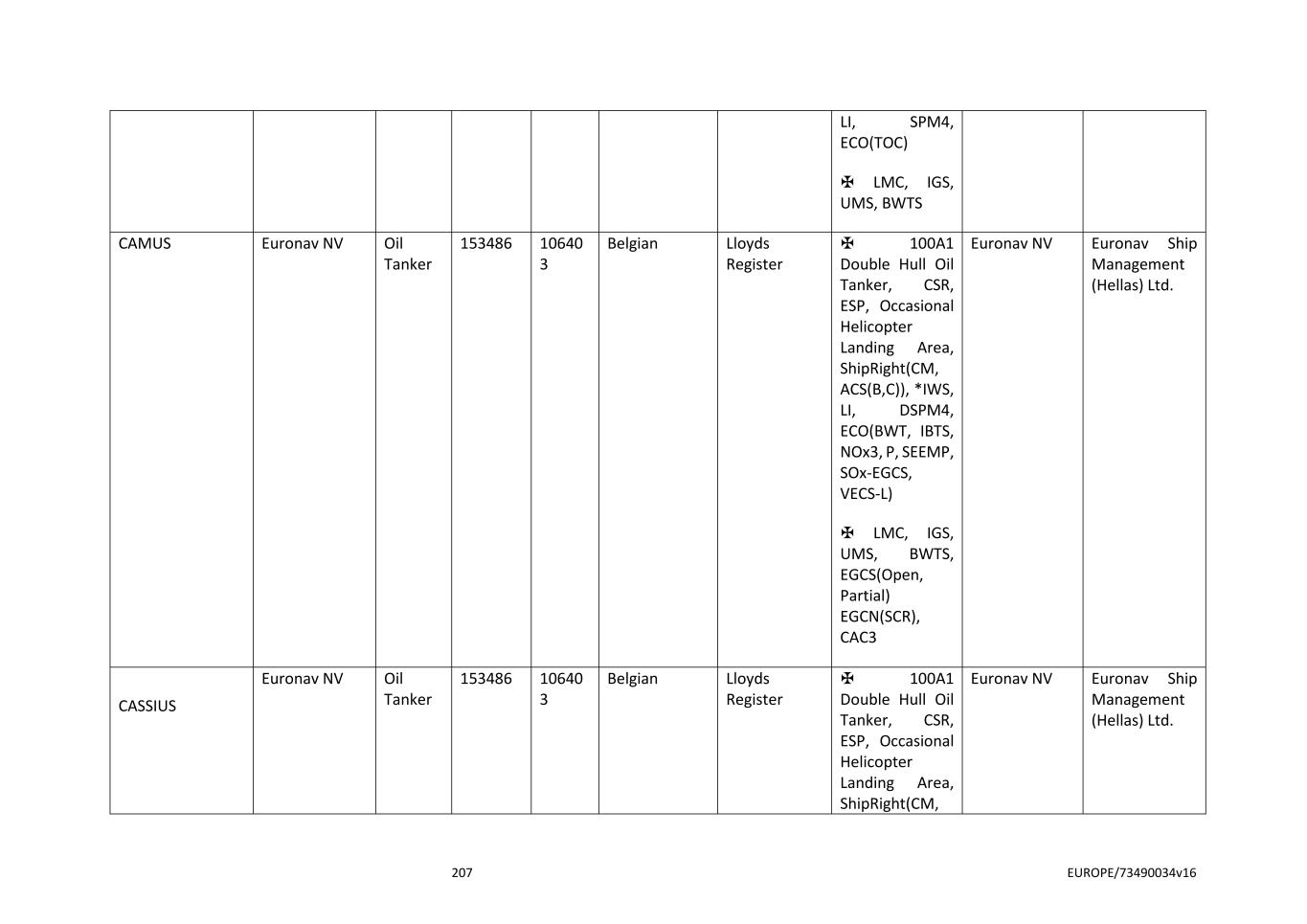 207 EUROPE/73490034v16 LI, SPM4, ECO(TOC) ✠ LMC, IGS, UMS, BWTS CAMUS Euronav NV Oil Tanker 153486 10640 3 Belgian Lloyds Register ✠ 100A1 Double Hull Oil Tanker, CSR, ESP, Occasional Helicopter Landing Area, ShipRight(CM, ACS(B,C)), *IWS, LI, DSPM4, ECO(BWT, IBTS, NOx3, P, SEEMP, SOx-EGCS, VECS-L) ✠ LMC, IGS, UMS, BWTS, EGCS(Open, Partial) EGCN(SCR), CAC3 Euronav NV Euronav Ship Management (Hellas) Ltd. CASSIUS Euronav NV Oil Tanker 153486 10640 3 Belgian Lloyds Register ✠ 100A1 Double Hull Oil Tanker, CSR, ESP, Occasional Helicopter Landing Area, ShipRight(CM, Euronav NV Euronav Ship Management (Hellas) Ltd.