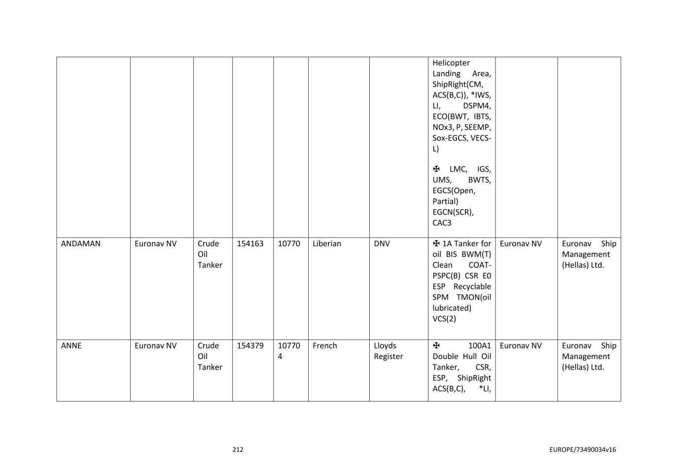 212 EUROPE/73490034v16 Helicopter Landing Area, ShipRight(CM, ACS(B,C)), *IWS, LI, DSPM4, ECO(BWT, IBTS, NOx3, P, SEEMP, Sox-EGCS, VECS- L) ✠ LMC, IGS, UMS, BWTS, EGCS(Open, Partial) EGCN(SCR), CAC3 ANDAMAN Euronav NV Crude Oil Tanker 154163 10770 Liberian DNV ✠ 1A Tanker for oil BIS BWM(T) Clean COAT- PSPC(B) CSR E0 ESP Recyclable SPM TMON(oil lubricated) VCS(2) Euronav NV Euronav Ship Management (Hellas) Ltd. ANNE Euronav NV Crude Oil Tanker 154379 10770 4 French Lloyds Register ✠ 100A1 Double Hull Oil Tanker, CSR, ESP, ShipRight ACS(B,C), *LI, Euronav NV Euronav Ship Management (Hellas) Ltd.